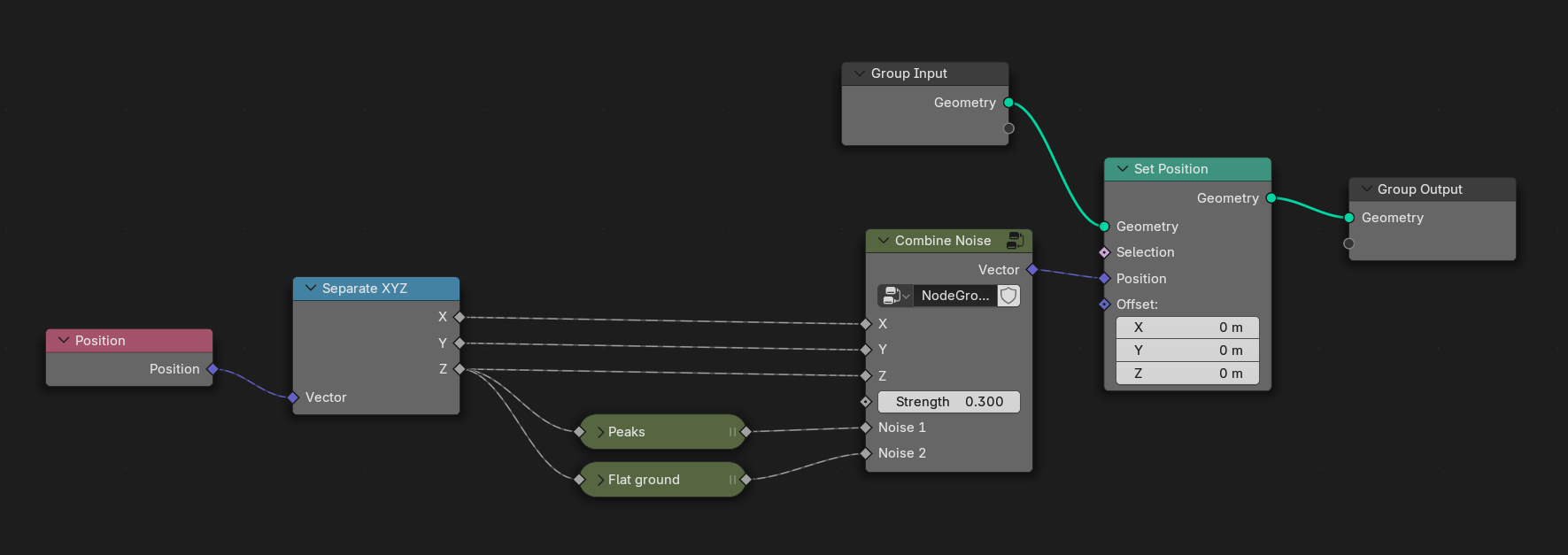Die Idee ist, per Geometry Nodes einen Displacement Modifier zu bauen, der sich je nach Eingabehöhe des Vertex anders verhält. Man nimmt also das Mesh, splitted es in XYZ und verschiebt die Z-Koordinate indem man Noise-Funktionen addiert, die von der Z-Koordinate abhängen.