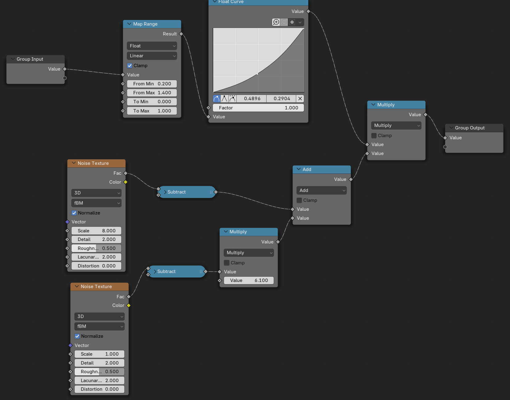 Das Setup dazu sieht so aus: Und hier einer der zwei Noise Nodes (Die Idee ist bei beiden gleich): Unten werden zunächst 2 Noise-Texturen mit unterschiedlicher Frequenz addiert. So kriegt man die scharfen, großen Spitzen und überall dazwischen die kleinen Bobbel. Das Ergebnis wird mit einem Faktor multipliziert, der oben berechnet wird, im wesentlichen also eine Kurve die von der Z-Koordinate abhängt.