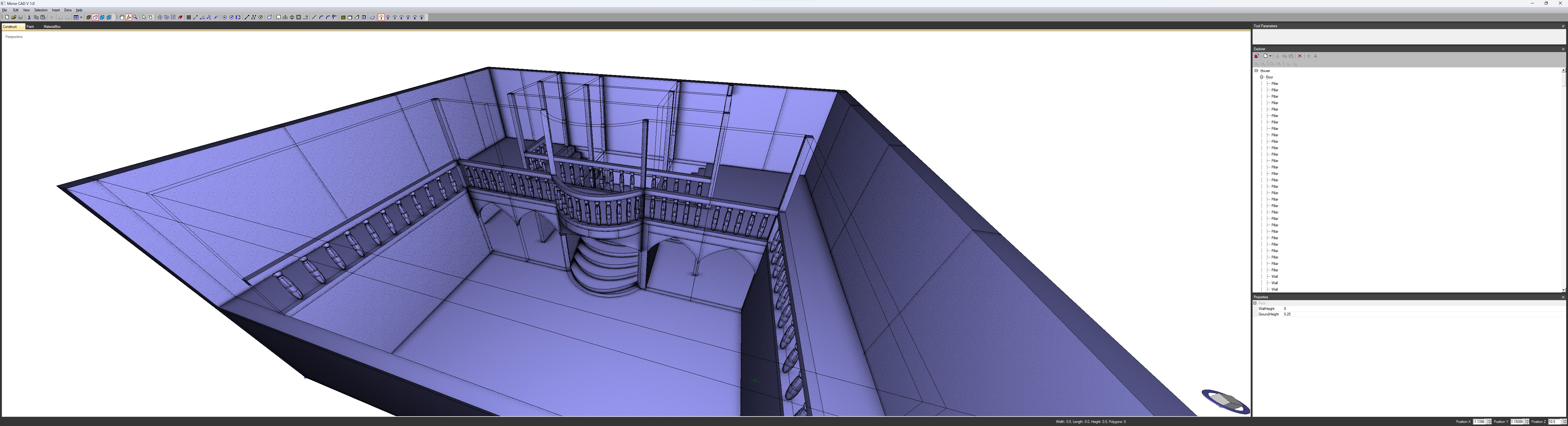 Habe eben ein halbwegs größeres Modell erstellt. Es ähnelt Starcows megageilem Modell. Ich habe die untere Etage nicht zu Ende modelliert. Es wären noch Säulen notwendig und ein anderer Bogen. Im Moment habe ich die Schnauze voll vom modellieren. 3 Stunden habe ich gebraucht. Bin aber nicht enttäuscht, immerhin läuft MirrorCAD stabil. Der Explorer ist extrem unübersichtlich mit seinem hierarchischem Content. Das will ich demnächst in anderer Weise gestalten. Obwohl ich das Treppensystem selbst gestaltet habe, musste ich erst überlegen, wie ich das mit dem Programm erstelle.