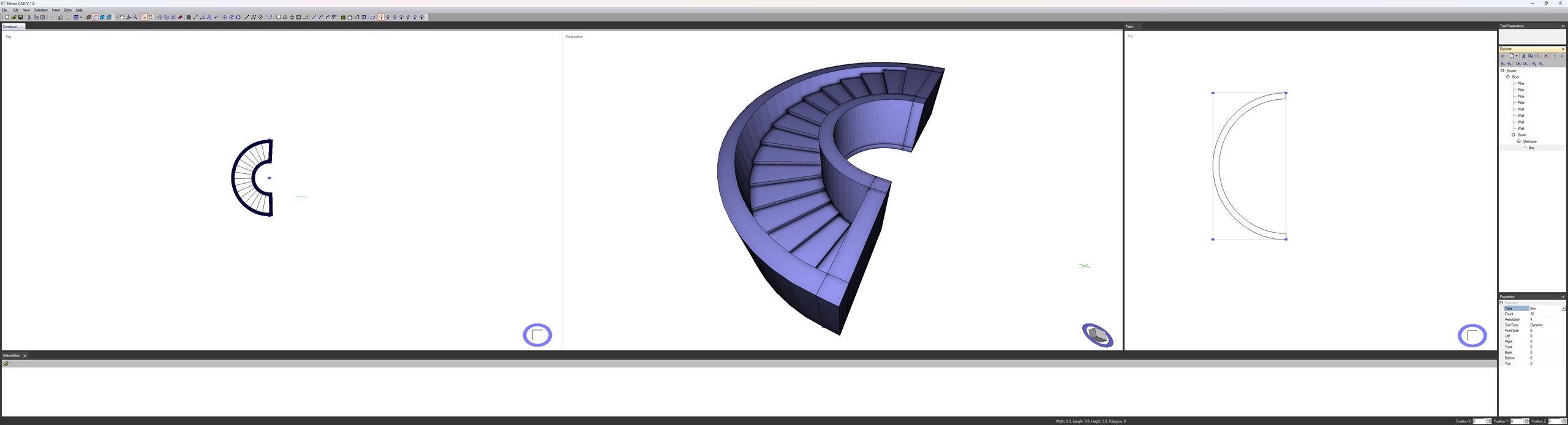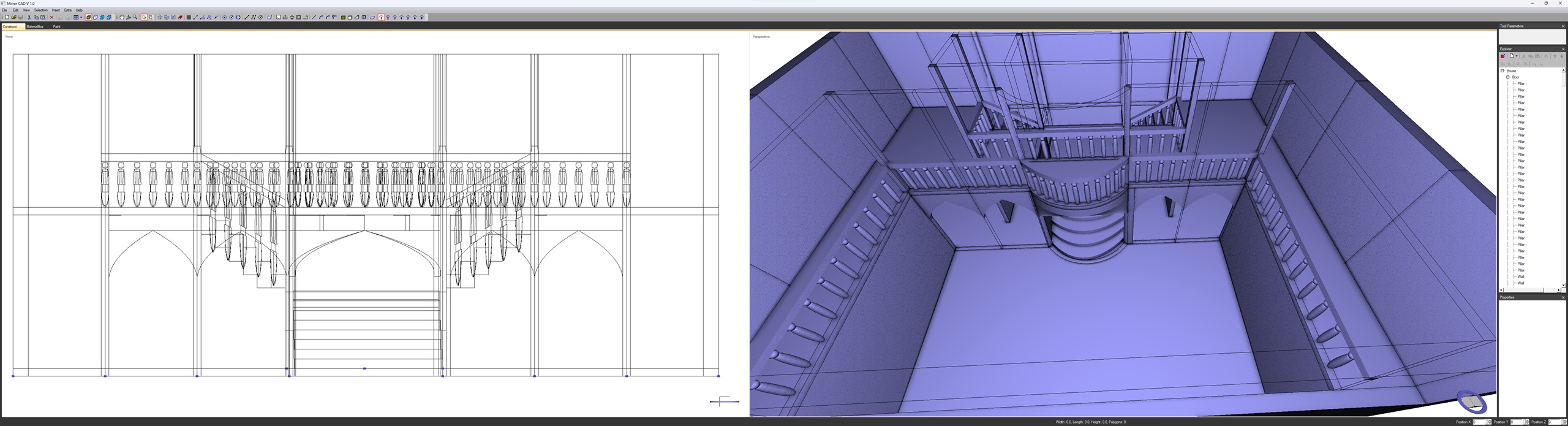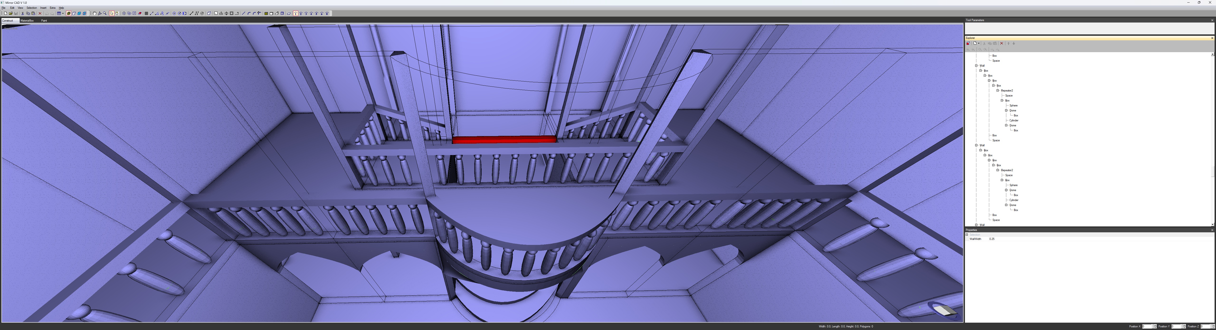Habe eben ein halbwegs größeres Modell erstellt. Es ähnelt Starcows megageilem Modell. Ich habe die untere Etage nicht zu Ende modelliert. Es wären noch Säulen notwendig und ein anderer Bogen. Im Moment habe ich die Schnauze voll vom modellieren. 3 Stunden habe ich gebraucht. Bin aber nicht enttäuscht, immerhin läuft MirrorCAD stabil. Der Explorer ist extrem unübersichtlich mit seinem hierarchischem Content. Das will ich demnächst in anderer Weise gestalten. Obwohl ich das Treppensystem selbst gestaltet habe, musste ich erst überlegen, wie ich das mit dem Programm erstelle.