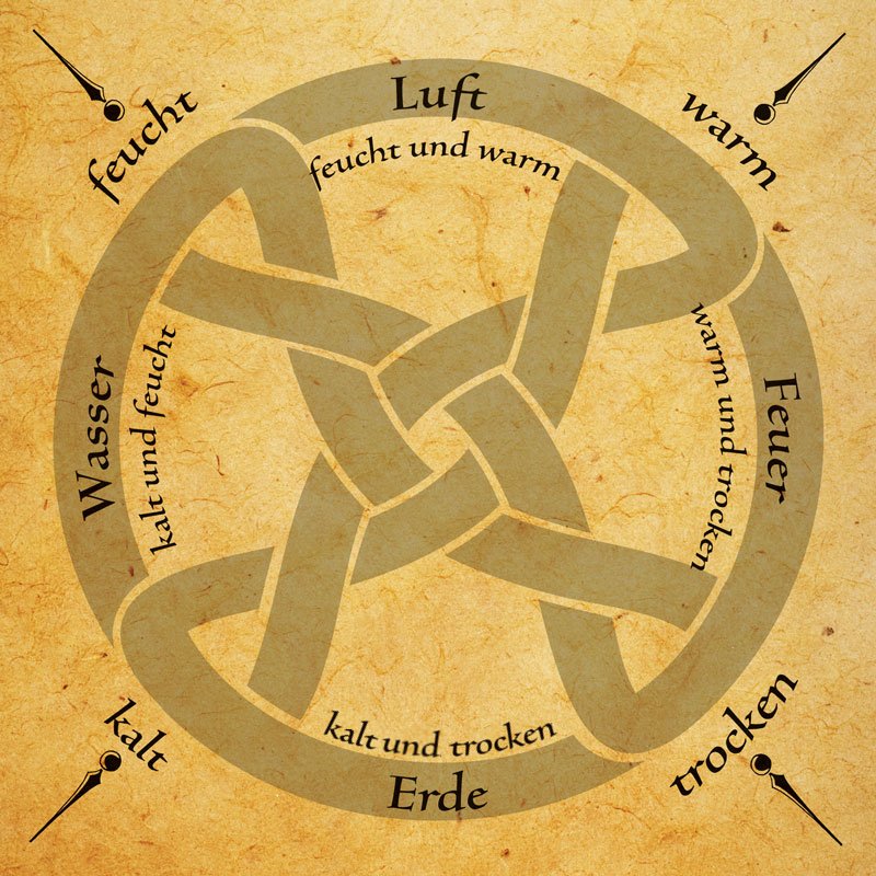 Man kann den 4 Elementen die Eigenschaften "Wärme" und "Feuchtigkeit" zuordnen (diese Grafik hab ich irgendwo im Internet gefunden):