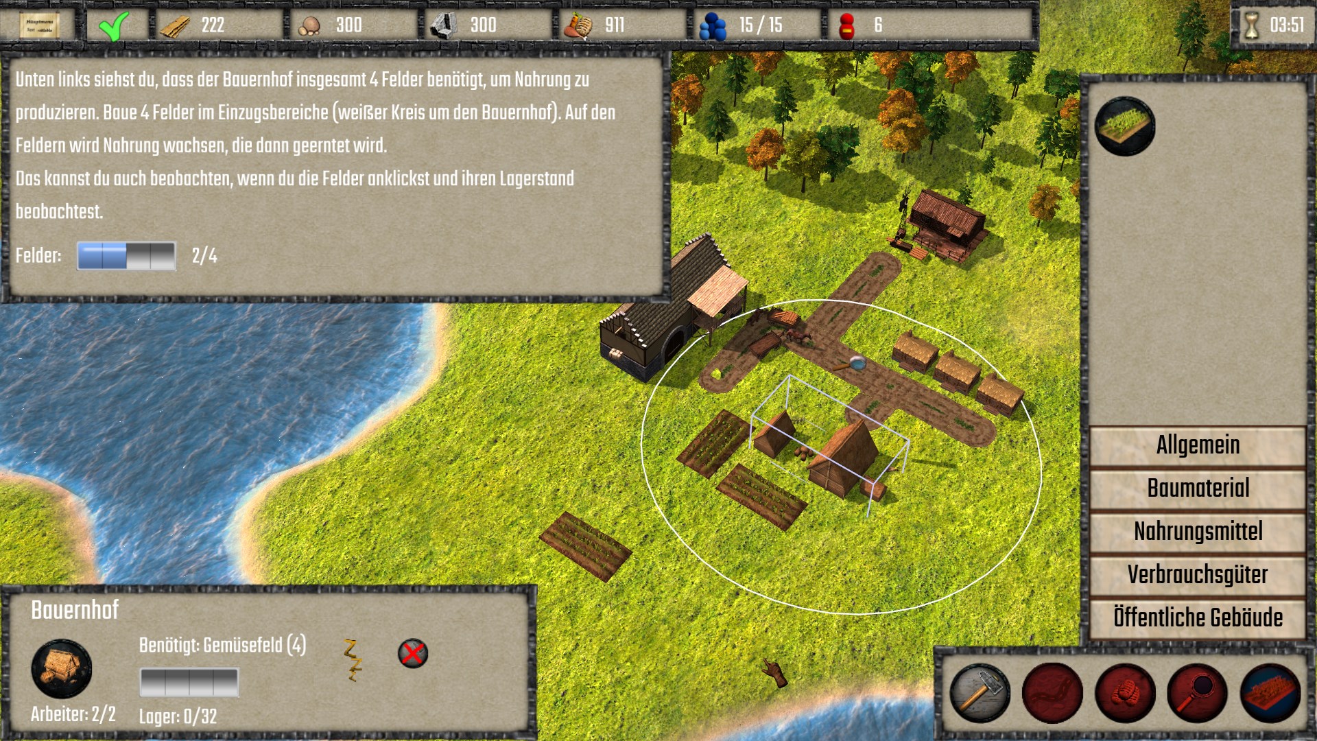 - Am Anfang sollte man erstmal nur 2 Häuser, ein Lager, einen Bauernhof, 4 Felder und dann einen Holzfäller bauen. Das sollte stabil sein und überleben.