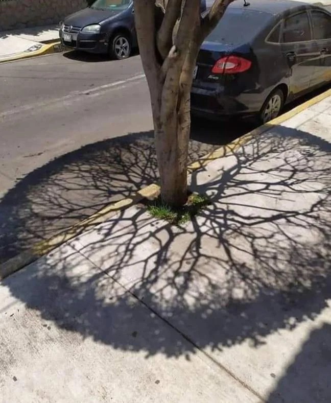 Ja, es stimmt schon, dass der Schatten sehr cool aussieht, aber leider hat das nicht so viel mit der Sonne zu tun, und vielmehr damit, dass der Baum einfach eine sehr ulkige Blätterverteilung hat. Die Sonne könnte 1 oder 2 Grad anders stehen, das Bild wäre immer noch genau so cool. Der Baumstamm ist ja nichteinmal gerade, der wirft ja bei jedem Sonnenwinkel Schatten. Also ja, cooles Bild, aber den Effekt leider nicht verstanden.