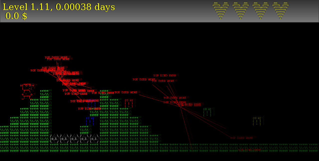 Durchaus spaßig, wie gesagt sehr stylisch, und eins der komplexeren Spiele... hier gibt's tatsächlich ein Menü, einen sinnvollen Spielablauf mit Start, Zwischentexten, ordentlichem Todesfeedback usw... gute Arbeit!