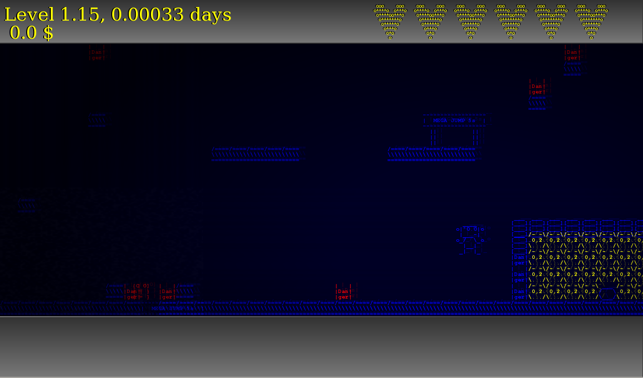 Das Spiel soll einfach nur Spaß machen, etwas Konzentration ist aber erforderlich. Das Spielziel ist, moeglichst lange durchzuhalten und nebenher gaaaanz viel Geld zu sammeln. Auch wenn es nun doch ein eher klassisches Jump'n'Run-Game geworden ist, habe ich versucht den Spielablauf moeglichst abwechslungsreich zu gestalten :-)
