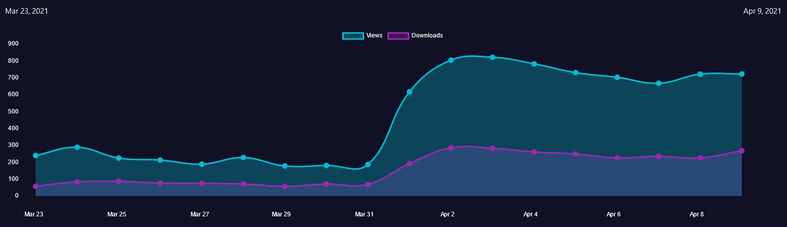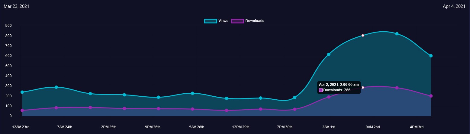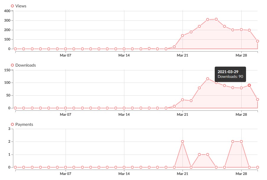 ca. 2 Tage später: 1,503 (+510) Views, 478(+178) Downloads, 4(+0) "Sales"