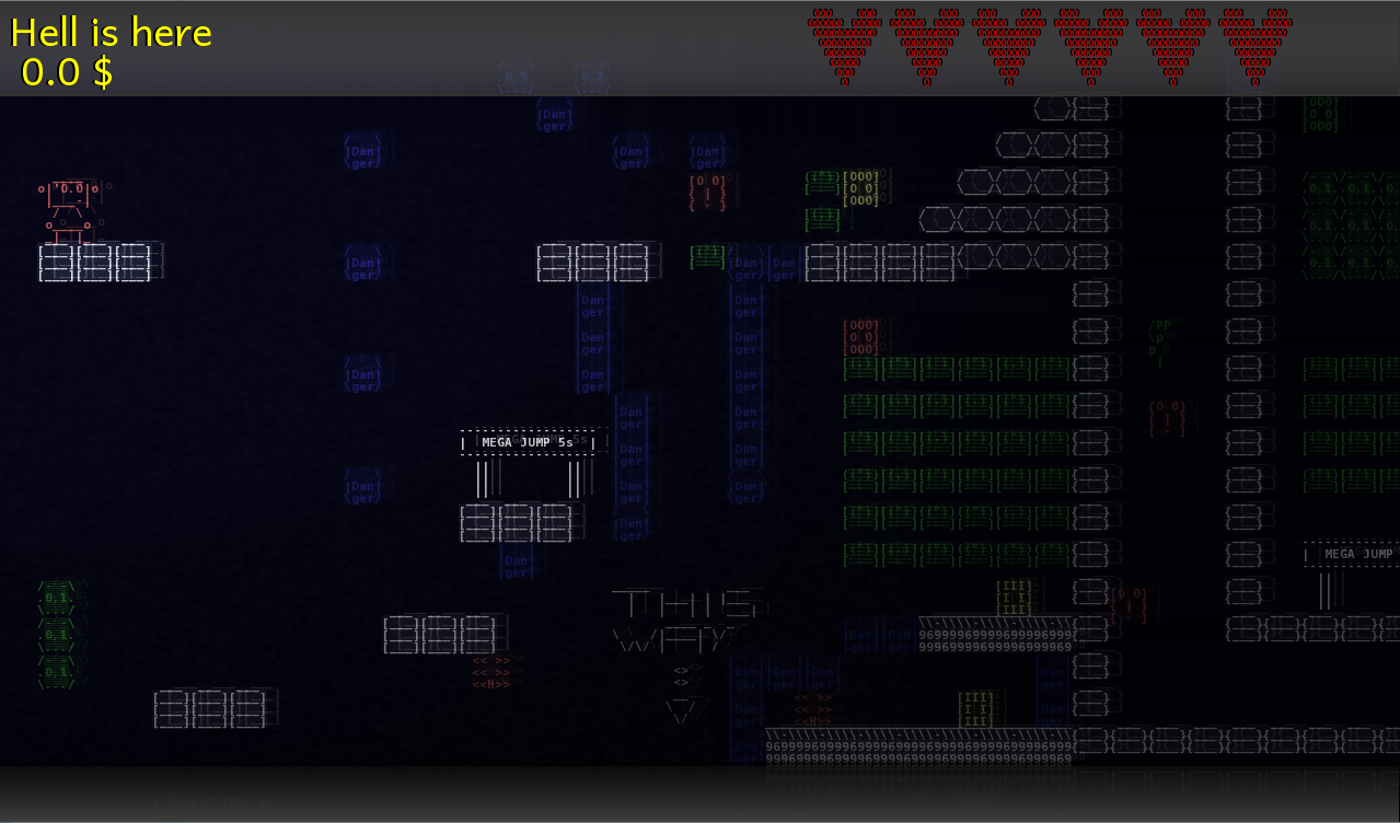 Es wird eine richtige Kampagne samt mittelmaessig epischer (aber, versprochen, provokanter!) Story auf einer Weltkarte mit unterschiedlichen Vegetationszonen geben, auf dem zweiten Screenshot ist deren aktuelle Version auch zu sehen. Dazu kommen kleinere Physikspielereien, Raetsel, Gemeinheiten, versteckte Schaetze, usw. Am ASCII-Look wird sich aber nichts aendern :-) Auf dem dritten Screenshot ist der aktuelle Prototyp des (in's Spiel eingebetteten) Level-Editors zu sehen. Der wurde einfach noetig, denn selbst fuer ASCII-Grafik ist die Content-beschaffung und -Erstellung das primaere Problem.