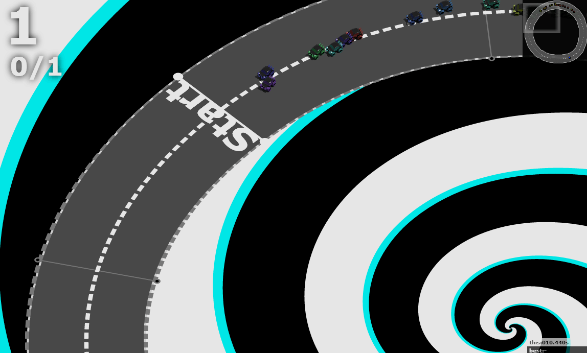 Sieht cool aus, ich find's auch etwas unübersichtlich. Du könntest ja mal einen Carrera-Bahn-Modus ausprobieren, vielleicht ein bisschen so wie bei PixelJunk Racers. Ansonsten fände ich einen Kreis als Markierung des eigenen Autos oder vielleicht sogar einen Pfeil der in Fahrtichtung zeigt sinnvoll.