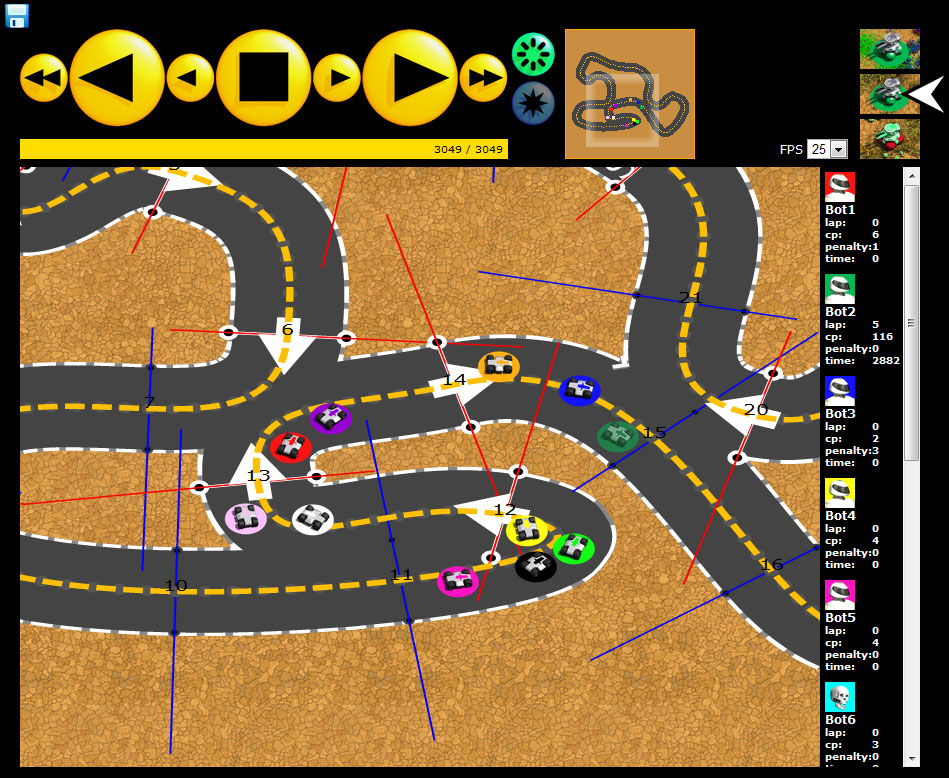 oben sieht man die abspielknöpfe, diese erlauben das rückspielen des rennens, das rennen wird aufgezeichnet. die aufzeichnung kann als "video" gespeichert werden, das funktioniert aber noch nicht 100% (die strecke fehlt noch).