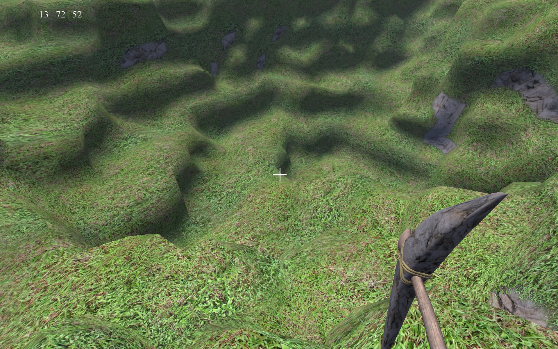 Man könnte einen ähnlichen Shader machen, der mir den Noise-Wert zurückgibt. Denn da das Noise ja eine gewissen Frequenz hat, kann ich bei zu hohen oder niedrigen Werten auch annahmen über die Umgebung treffen. So könnte ich Anhand eines Pixels entscheiden, ob ein Cluster komplett Luft oder Erde ist, und wenn zudem dann keine Veränderungen vom Spieler getätigt wurden, muss das Cluster nicht mehr weiter berechnet werden und kann als leer ( von der Geometrie her ) eingestuft werden.