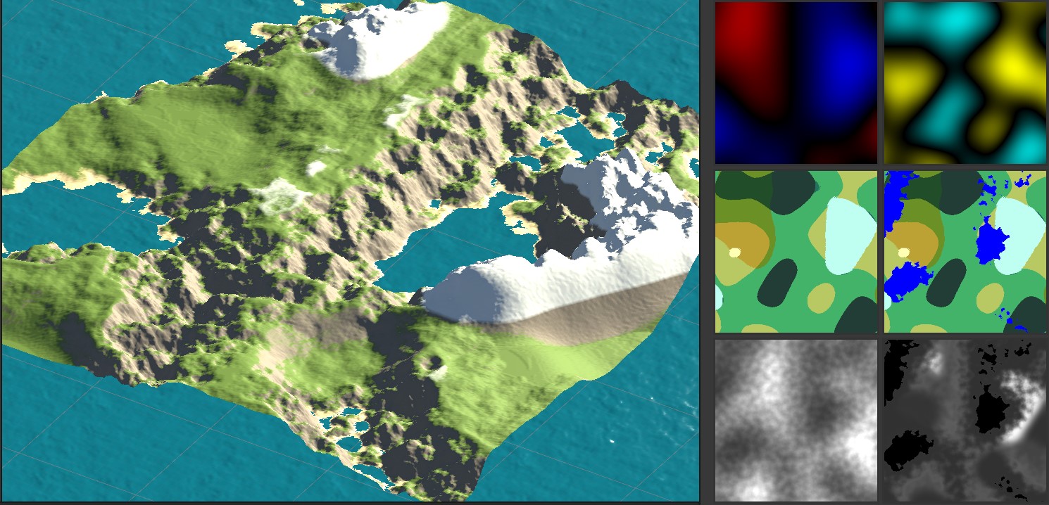 Diese kann man eliminieren, indem man die einzelnen Biome ineinander "blurred" und dann die einzelnen Biome-Filter/Abbildungsfunktionen gewichtet summiert. Alles zusammen sieht dann so aus Klar ist, dass meine Version viel simpler ist, als die in dem verlinkten Artikel.