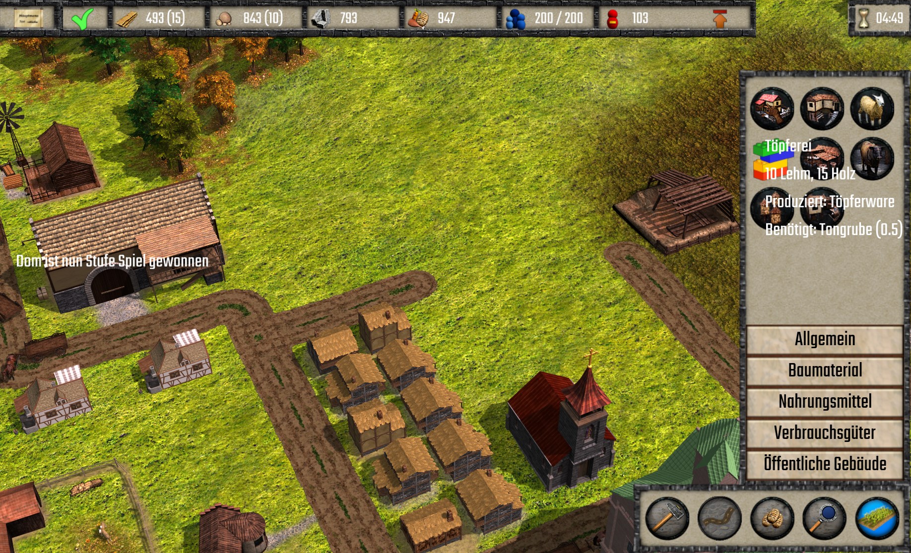 Hier im Baumenü sieht man jetzt nicht nur den Namen und die Baukosten, sondern auch welche Waren dann produziert werden und welche umliegenden Gebäude (und wie viele!) dazu benötigt werden. Warenketten sind ja ein zentrales Spielelement, und die sollen ja möglichst effizient sein. Eine Metzgerei ist etwa erst mit 2 Schweineställen voll ausgelastet. Das könnte der Spieler jetzt einfach selber herausfinden, in dem er beobachtet, was passiert: Wenn die Metzgerei die Hälfte der Zeit Däumchen dreht, braucht man offensichtlich mehr Schweine, wenn sich in den Schweineställen die Schweine stapeln (äh, ja), werden offensichtlich nicht genügend abgeholt und man bräuchte mehr Metzgereien. Aber letztendlich hab ich mir gedacht, dass es einerseits etwas nervig ist, dass selber herauszufinden und man sich ja andererseits eh irgendwann einfach merkt, was man bauen sollte. Es ist also nicht wirklich eine spielerische Herausforderung (was ja gut, weil interessant wäre) sondern eher ein Hindernis - deswegen gibts die Information jetzt einfach direkt.