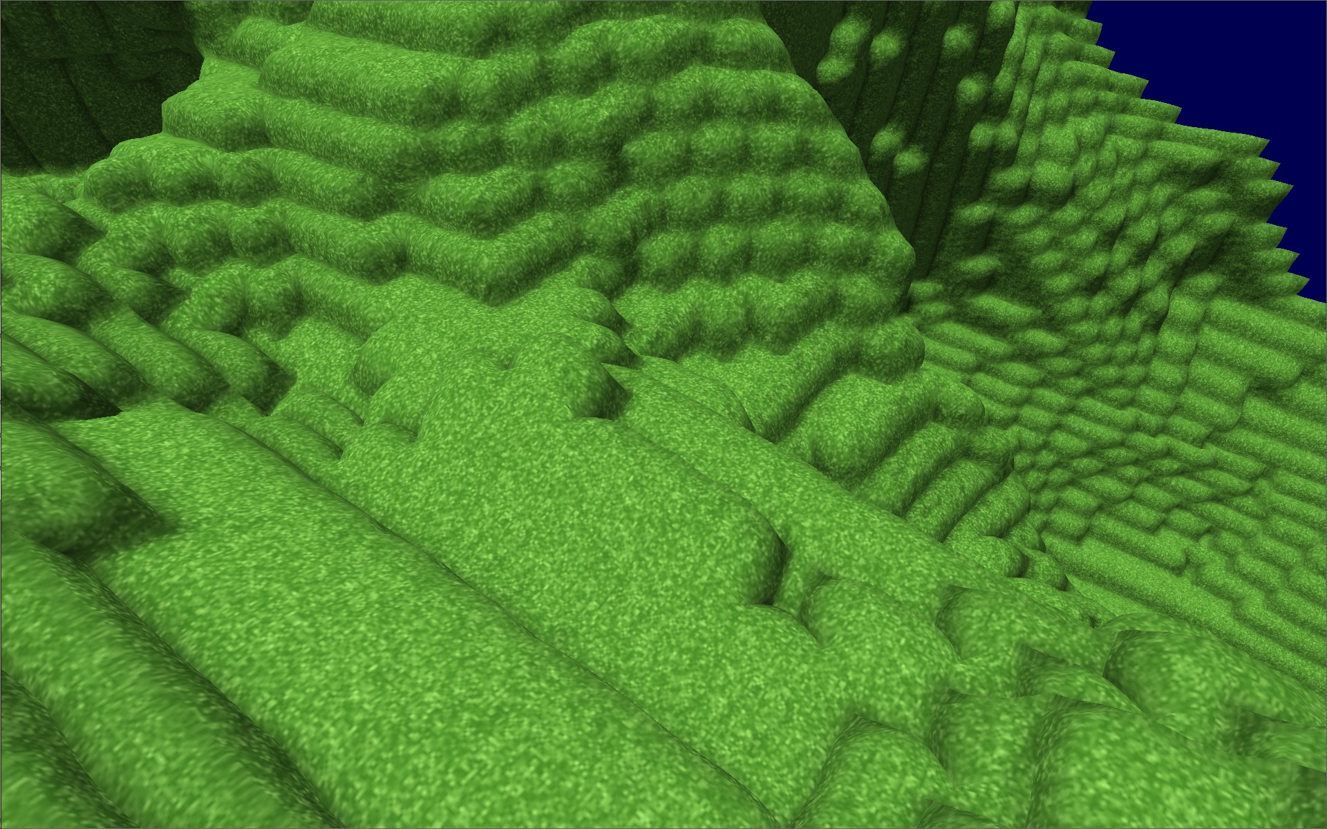 Wenn dein Gameplay Bloecke braucht, dann musst du sie wohl behalten. Und wenn du nur nen Minecraft Clone machst, wird es dann wohl auch danach aussehen. Ich denke bei den Bildern aber eher an anderes z.b. Descent (falls das noch wer kennt), die wahrscheinlich nur die Polys eines deiner Wuerfel brauchen fuer den gesamten Bildschirm um trotzdem wesentlich stimmiger auszusehen. Meine Idee waere zunaechst eine relative glatte Flaeche zu erzeugen und um diese dann zwei Huellen. Innerhalb derer werden die Vertices dann verschoben z.b. mit einer Noisefunktion oder einer Displacementmap.