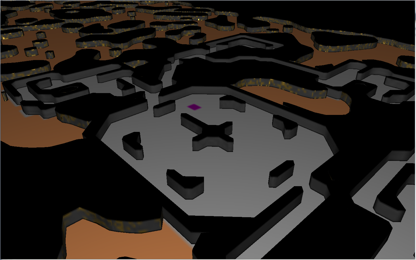 Ich bin nicht zu allzu viel gekommen, aber es gibt jetzt ein rudimentäres Mapsystem und sobald wir die natürlichen Caves per Cellular Automata fertig haben und mit den Künstlichen Dungeons gemerged haben, wird die Karte auch sinnvoller befüllt. Man sieht noch sehr gut, dass die Normalen vom Marching Cubes noch rumbuggen, dass steht aber schon auf meiner virtuellen TODO-Liste, genauso wie vernünftiges Marching Cubes Texturing ;) Durch die fehlerhaften Normalen sieht man momentan sehr gut, dass die Karte aus Kästchen besteht^^