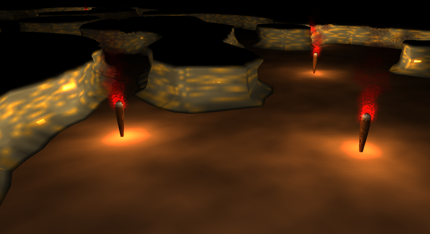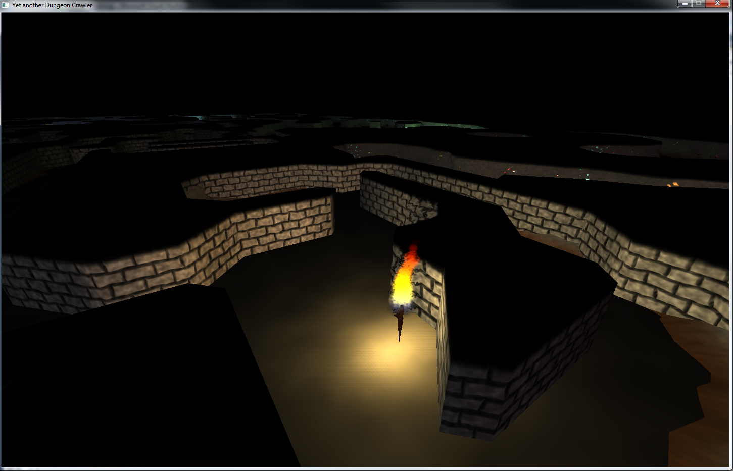 So, nun gibt es ein wenig mehr Beleuchtung, etwas bessere Wandgeometrien und rudimentäre Fackel-modelle (per Bézier-Kurven-Rotations-Körper ;) )
