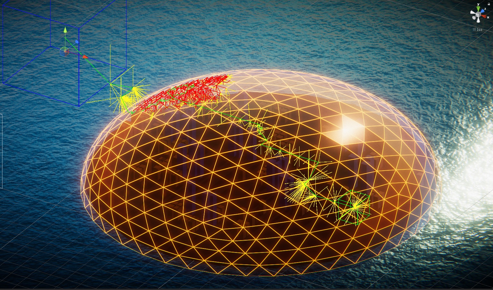 So sieht der momentane Stand aus für einen Pfad von innerhalb der Stadt nach Ausserhalb der Kuppel. Den Pfad jetzt noch glätten/kürzen, Splinekurve drüberlegen und dann sollte das mit den fliegenden Gegnern so langsam gehen.