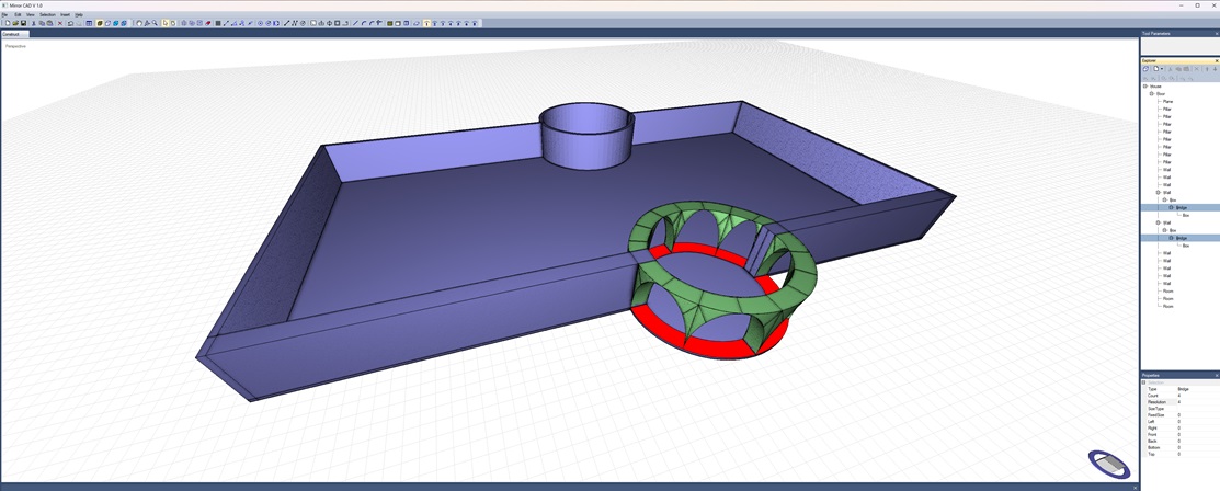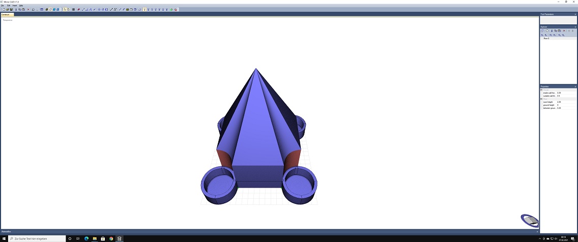Das neue Konzept wird langsam sichtbar. Wie erwartet habe ich jetzt keine Timing - Probleme mehr. Das alte Konzept wird vielleicht noch in einem anderen Programm Verwendung finden. Es werden nach wie vor konkave Polygone und auch gekrümmte Flächen unterstützt. Das Hilfesystem greift jetzt überall. Das war bei dem alten MirrorCAD nicht überall der Fall. Rechts der Explorer ist sinnlos geworden. Er wird nicht mehr benötigt. Vielleicht mache ich dort Materialien hin, auch wenn das Konzeptionell nicht so richtig passt. Vielleicht fällt mir diesbezüglich noch eine Lösung ein.