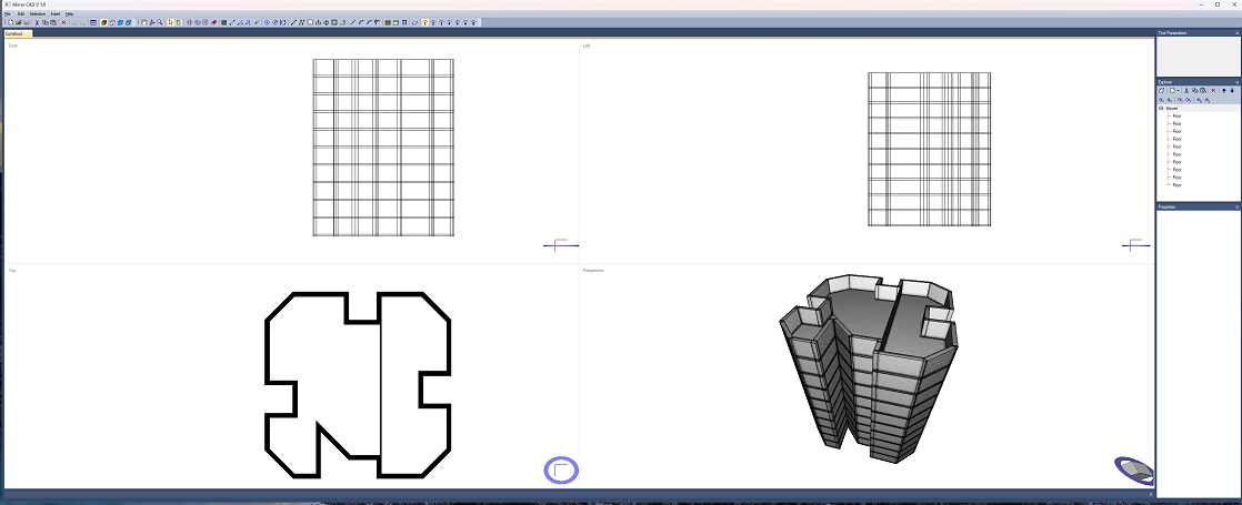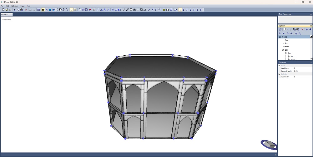 Zum aktuellen Stand möchte ich diesen Screenshot veröffentlichen. Man benötigt wirklich nur wenige Mausklicks um dieses Gebäude zu modellieren. Ich habe mich entschlossen wieder Softcube's in die Wände zu machen. Leider können Wände nicht mehr gekrümmt sein, dafür ist das neue MirrorCAD schneller. Vielelicht entscheide ich mich noch um und mache sie zumindest bei Einsatz der Softcubes biegbar. Aber wenn man keinen Softcube in einer Wand ( geht auch geschossübergreifend ) macht, dann wird er auf jeden Fall gerade sein.