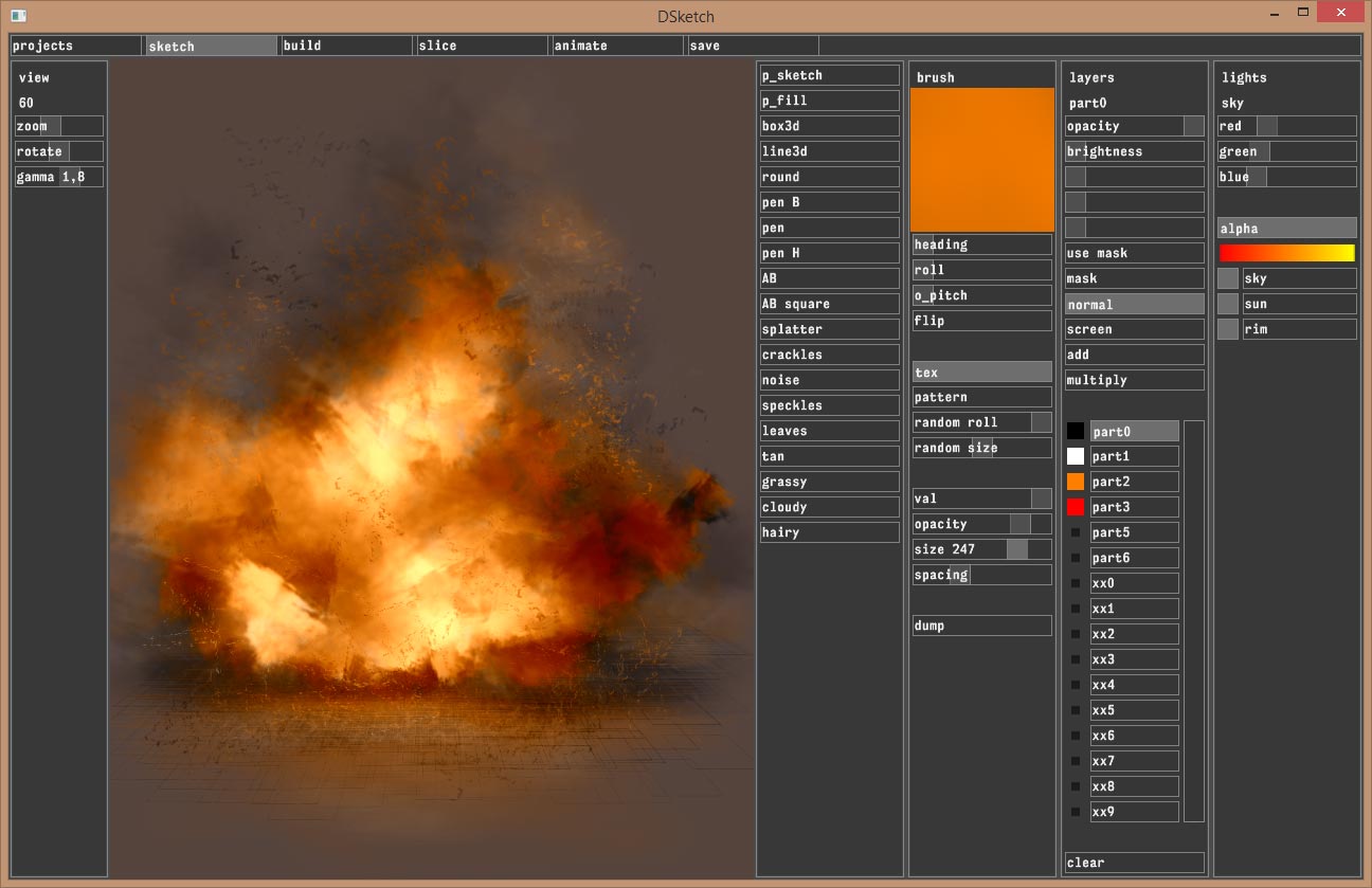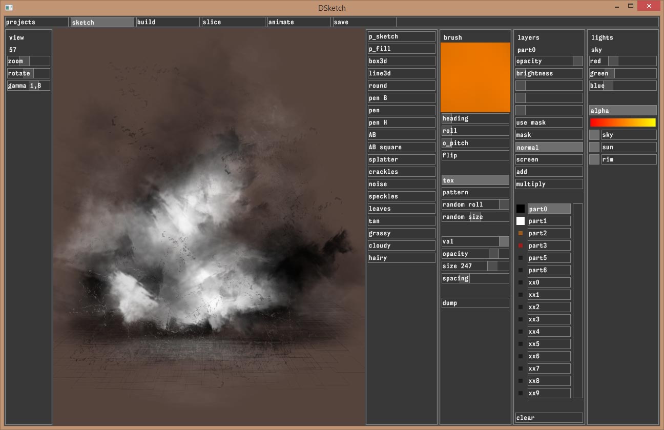 Technisch ist nicht allzuviel passiert. Statt ein Mesh aus einzelnen Vertices zu bauen, kann man nun auch Primitives in die Szene setzen und auswählen, welche Layer jeweils auf deren Oberfläche projiziert werden. Damit wird es schon langsam brauchbar. Bedient sich aber noch arg sperrig.