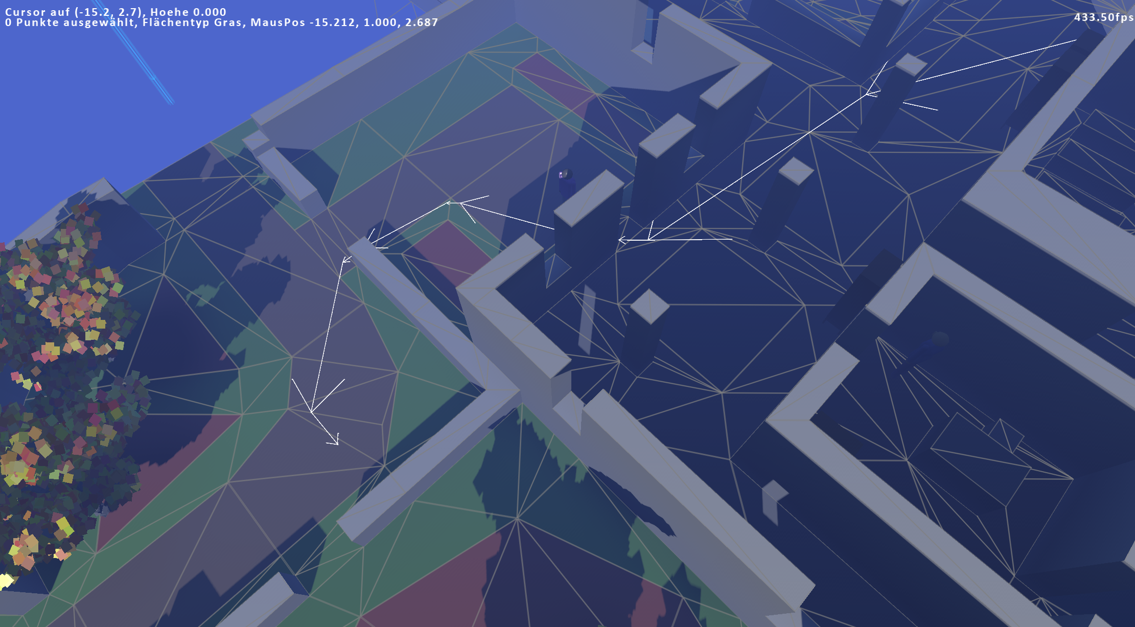 Dafür habe ich jetzt eine Lösung implementiert. Die Suche geht rekursiv durch die Flächen vom Suchzentrum aus. Zum Einen markiert sie in einer gewissen Entfernung die Flächen als potentielle Umschau-Stellen, zum Anderen markiert sie die Kanten, an denen die Agentin durchkommen könnte, der NSC aber nicht. Letzteres sind dann halbhohe Schwellen wie z.B. Fenster. Leider aber nicht nur, der halbhohe "Schreibtisch" im Nebenzimmer wird auch für ein Fenster gehalten.