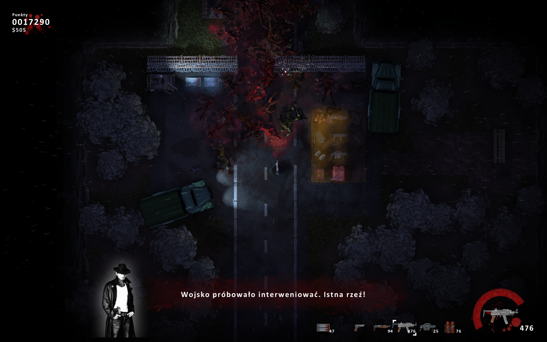Der neue Spielmodus "Flüchtlingszug" ist ebenso ein Kompromiss, der der Zeitnot geschuldet ist. Der orginale Plan eines Freeplay-Modus, in dem man ein Dorf aufbauen und verteidigen kann und rundrum zufällig generierte Umgebungen nach Resourcen abgrasen kann, hat konzeptuell ein paar Unklarheiten und benötigt vor allem einige neue Assets wie z.B. Spezialgebäude. Das schaffen wir nicht bis dahin. Im Flüchtlingszug dagegen können wir größtenteils mit existierendem Material arbeiten. Eins bis vier Spieler laufen von links nach rechts über eine zufallsgenerierte Straße mit ein bisschen Landschaft drüber und drunter. Hinter ihnen steht ein Transporter und diverse Mitbürger, die sicher bis zum Ziel ganz rechts geleitet werden sollen. Der oder die Spieler laufen nun vorraus, erkunden die umgebenden Gebäude, finden evtl. zusätzliche Resourcen oder Überlebende und ballern vor allem alle Bedrohungen aus dem Weg. Das Ziel ist, den Flüchtlingszug so schnell wie möglich, so vollständig wie möglich und so blutig wie möglich ans Ziel zu bekommen, um sich in die Highscoreliste eintragen zu dürfen.