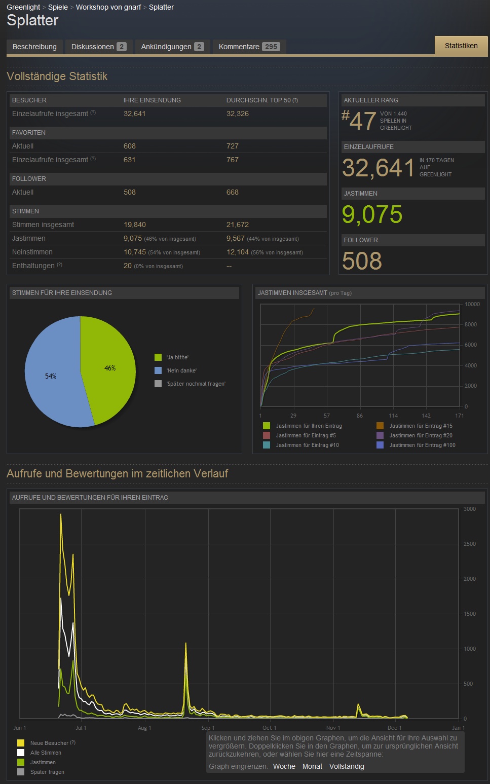 PLATZ 47! Anscheinend ist mal wieder ein Riesenhaufen Spiele grün beleuchtet worden, so dass Splatter auf Platz 47 vorgerückt ist! Das heißt, die Chancen stehen gut, dass Splatter Anfang nächsten Jahres auf Steam verfügbar sein wird. Keine Ahnung, ob das bis dahin noch irgendwas wert ist, aber.... Wow.