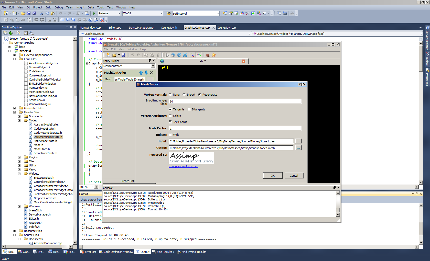 Wie zu sehen ist, ist der Ressourcen-Import bereits voll integriert. Dabei steckt die gesamte Funktionalität in einem kleinen Konsolen-Tool (berc), in welchem Assimp die Hauptarbeit leistet und ich anschließend die importierten Daten entweder zum Rendern in handliche Binärformate oder für PhysX in umständliche Objekthierarchien umwandle. Dieses Tool habe ich bisher einfach manuell über die Konsole betrieben, insofern beschränkt sich die Editor-Integration auf eine simple UI und einen entsprechenden Prozessaufruf.