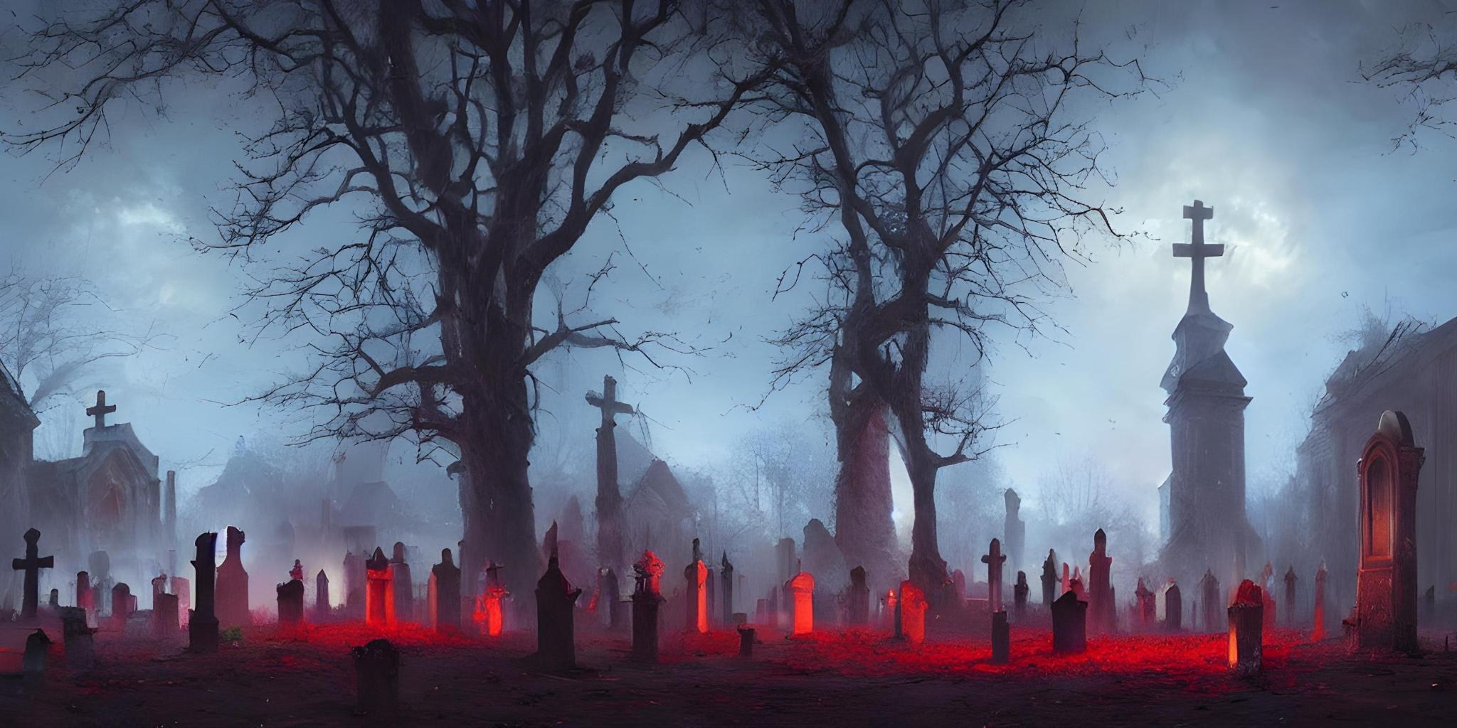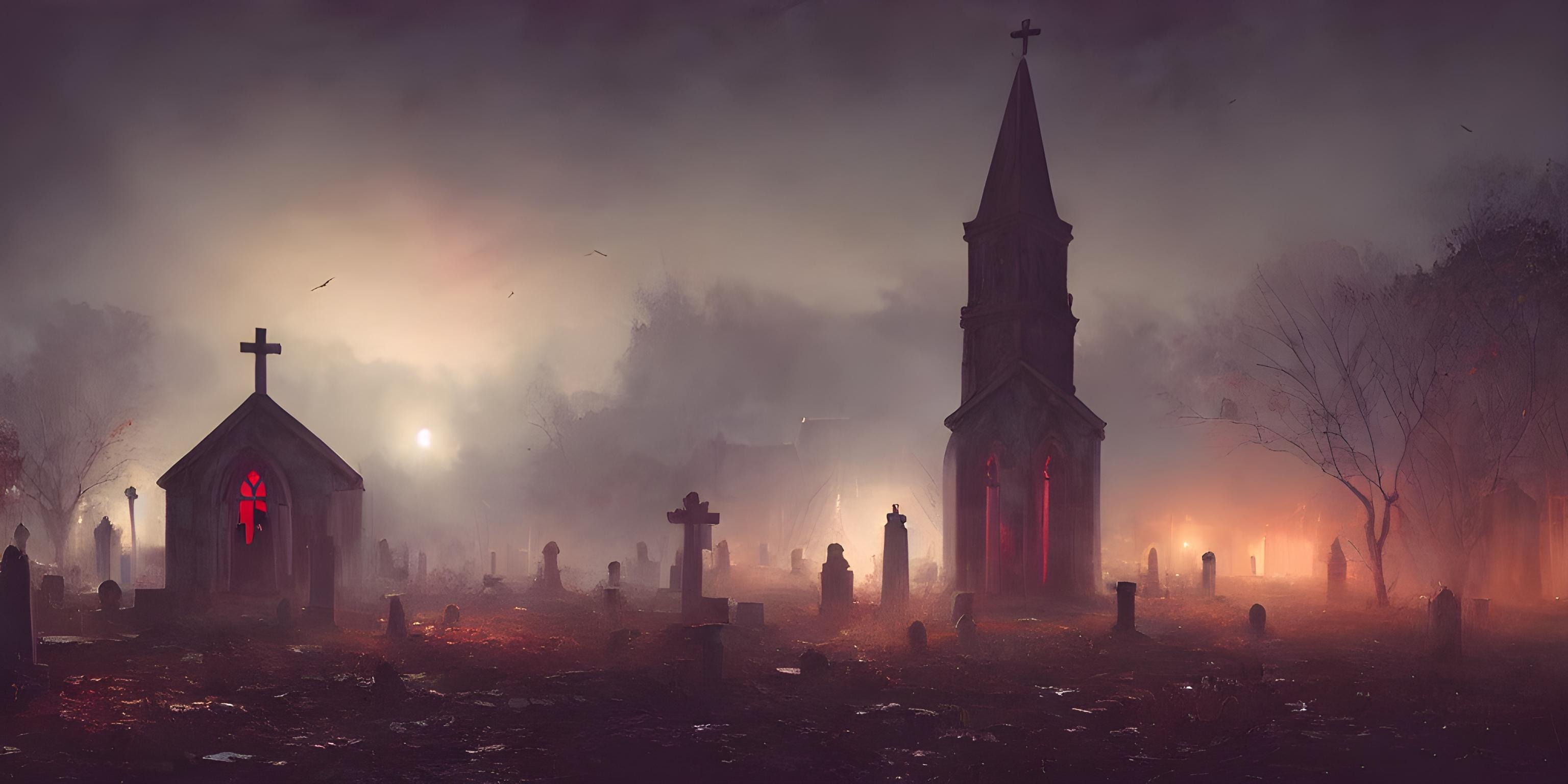 Bild 3-5: "A graveyard at night. Zombies everywhere. A small church with red-lit windows is in the background. sharp focus, wide shot, trending on artstation, masterpiece, by Greg Rutkowski, by Ross Tran, bu Fenghua Yhong, Octane, Soft Render, Oil on canvas, Colorful, cinematic, environmental concept art"