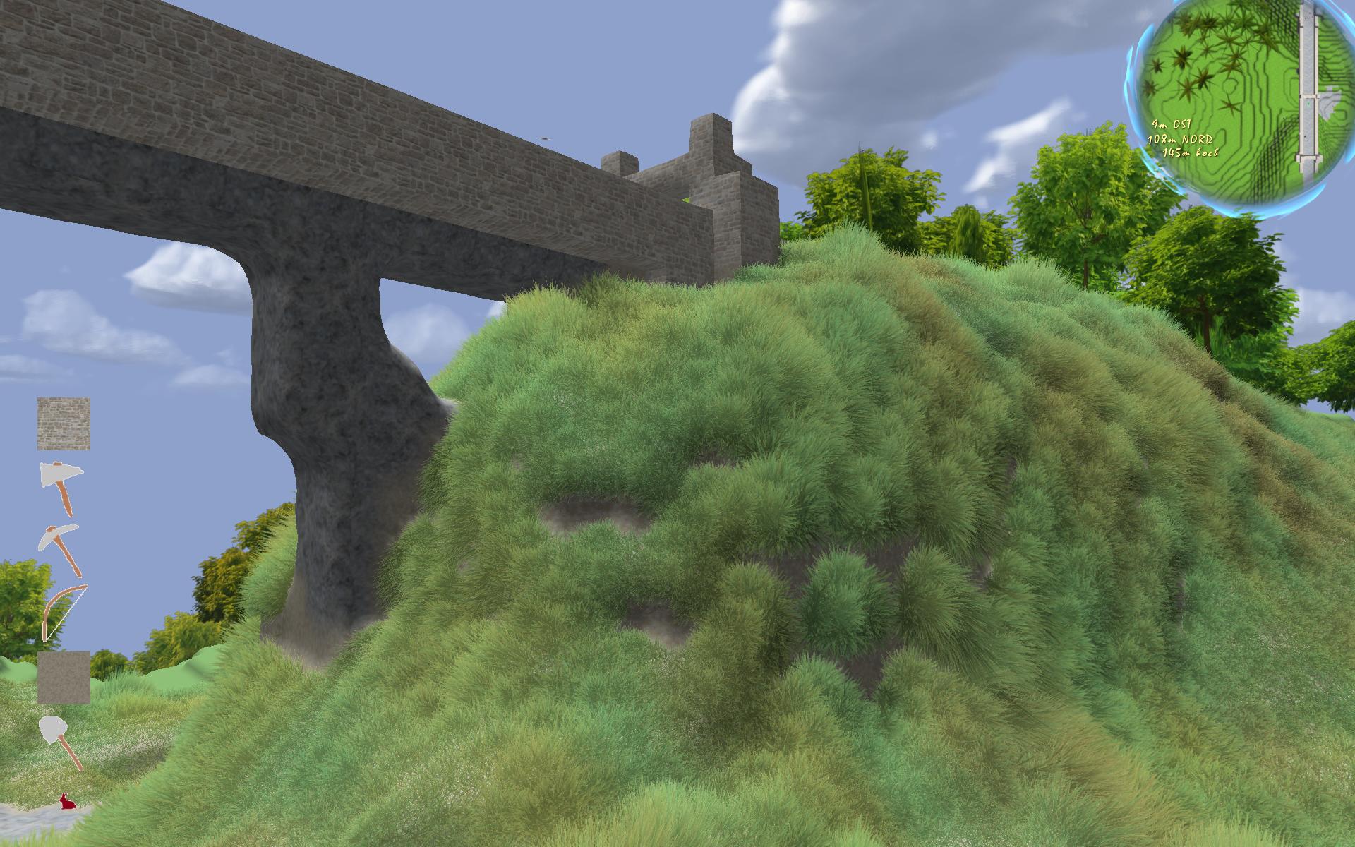 Wenn man einen Schritt weiter geht, könnte man sich überhaupt vom Blocksystem fürs Terrain lösen. Man baut zwar aus Blöcken, aber das Terrain muss dazu nichtmehr aus Blöcken bestehen. Um allerdings Blöcke auf dem Untergrund zu platzieren, muss man erst ein Fundament schaffen.