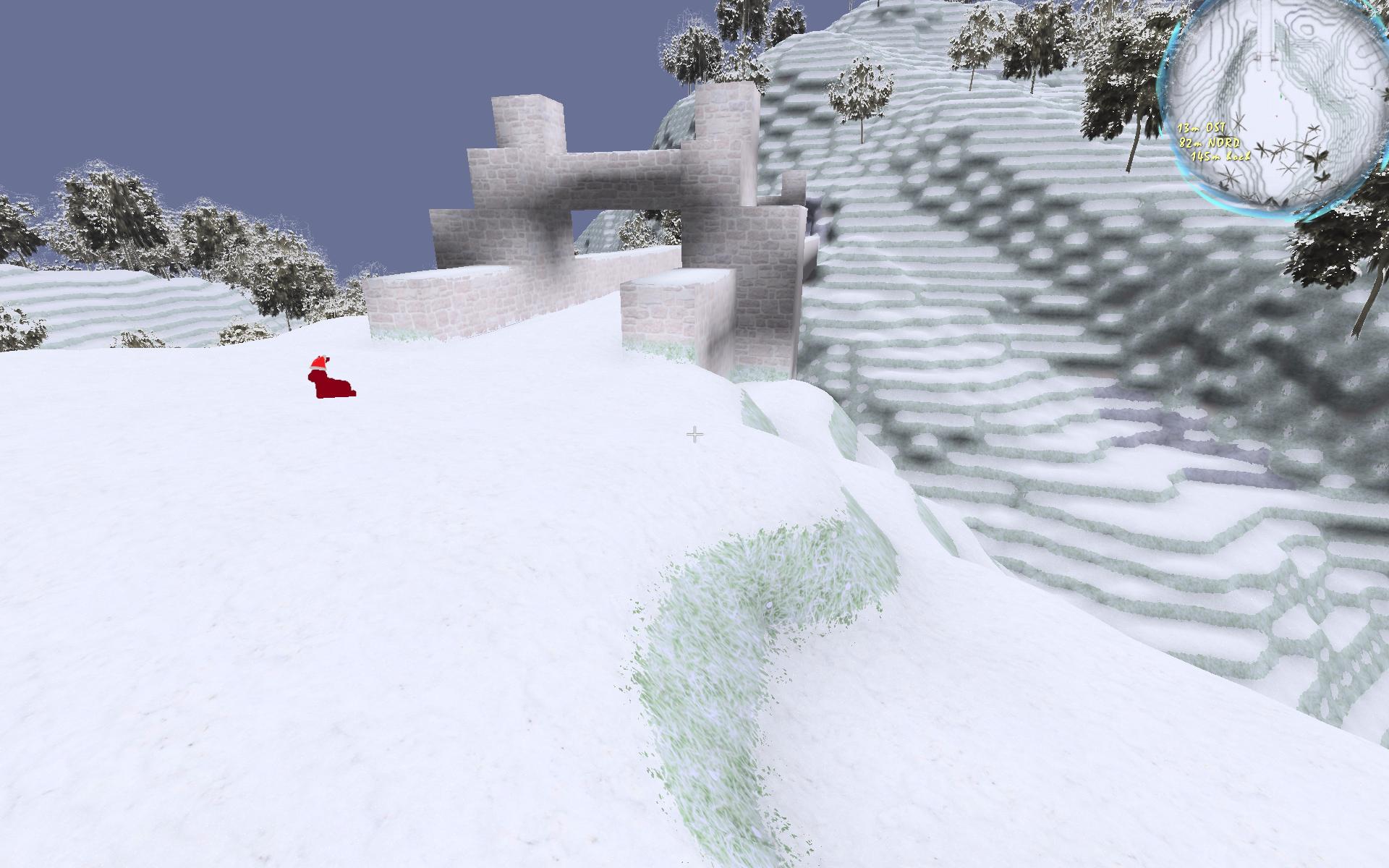 Aber nun kam das größte Fiasko... das Gras... das passt wohl eindeutig nicht in die Winterlandschaft. Habe probiert, es ab einer gewissen höhe dann weiß zu machen. Das sah dann auch recht gut aus. Danach mal einfach die Farben angepasst, die so ein wenig blau darzustellen, wie bei Eis... aber da die sich ja bewegen nicht sehr glaubwürdig. Wollte den Wind deaktivieren, ging nicht, weil der noch weiter unten gebraucht wurde. Hatte das immer in so kleinen "Christmas Regions" geändert, und da hätte ich da Zeilenweise durchwurschteln müssen. Ne, dann blieb halt der Wind, aber mit den Eisfarben konnte ich dadurch abhacken. Nun ist die ursprüngliche Variante. Am unglaubwürdigsten war nun wohl, dass das Gras überall war. Also an manchen Stellen wegfiltern, damit es nicht mehr überall wuchert. Dadurch wirkte für mich die Szene schon sehr viel glaubwürdiger.