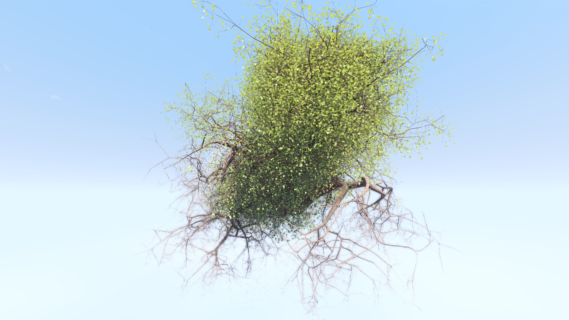 Jedenfalls bereitet mir ein bisschen der Übergang zwischen Baumstamm und Wurzeln kopfzerbrechen. Denn wie geht das ineinander über? Würde man es exakt machen wollen bräuchte man hier eine implizite Oberfläche, die dann trianguliert wird. Das ist aber schon irgendwie ganz schöner Aufwand. Oder ich belasse es einfach bei meinem alten Verfahren, wo ich dann an den Baumstamm Geäst nach unten hänge, wo dann quasi jede große Startwurzel aus dem Segment des Baumstamms erwächst.