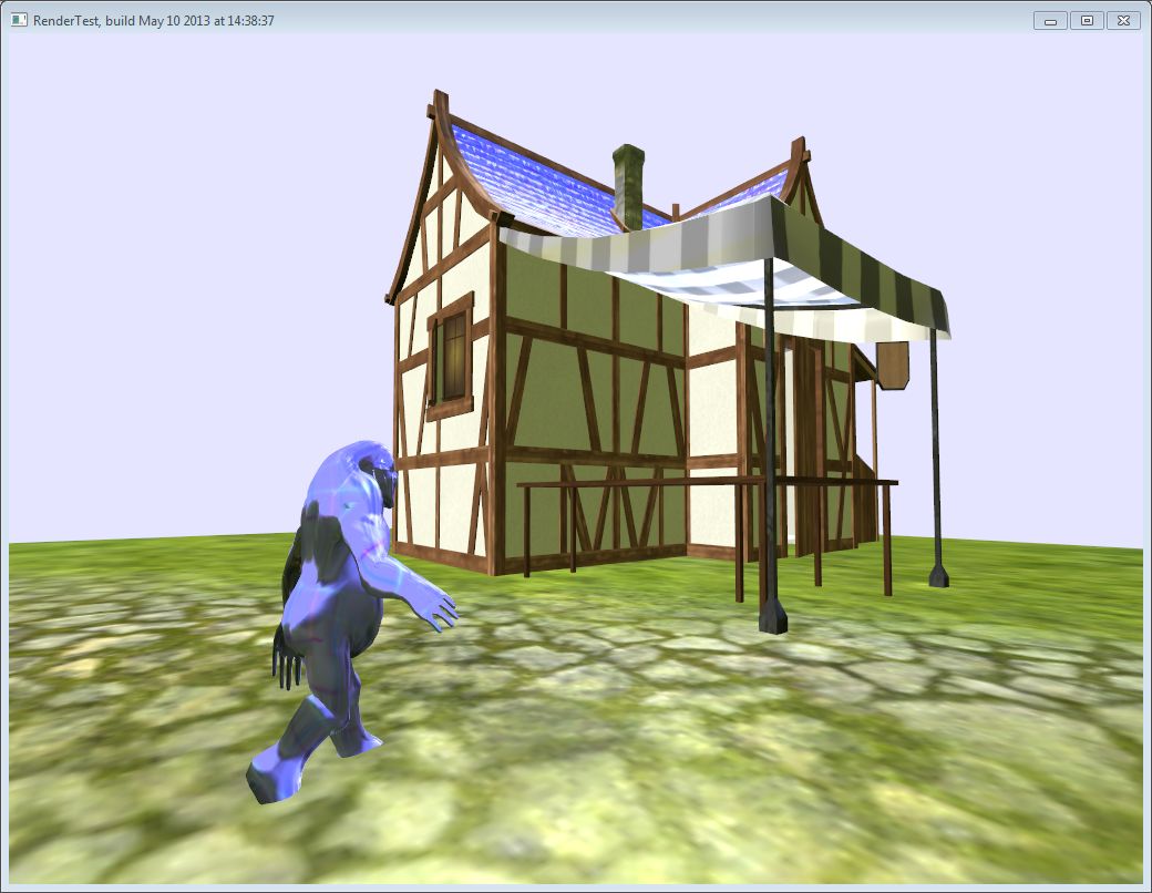 Das Bild zeigt einen fetten, nackten Zombie, der im Sonnenschein unterwegs zur idyllischen Bäckerei ist. Leider kommt er nie an, weil er auf der Stelle läuft. Außerdem sind ein paar Colormaps leider Normalmaps, da der Texturladethread ein paar Nebenläufigkeitsprobleme hat.