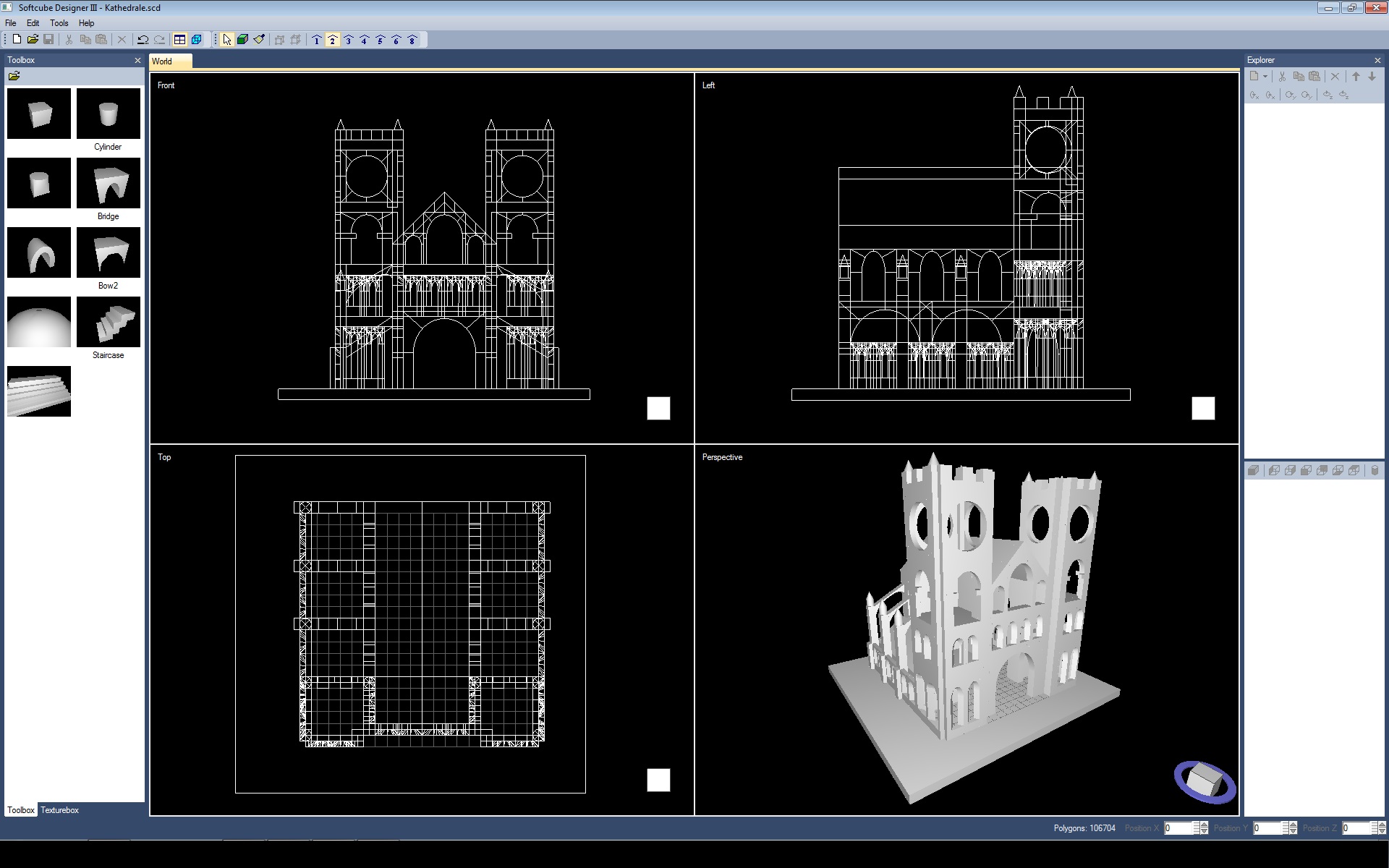 Hallo, ich wollte mal eine kleine Kathedrale zeigen die ich mit meinem Softcube Designer 3.0 erstellt habe. Insgesamt geht das Modellieren ziemlich flüssig. Die Datei Kathedrale.scd ist 649 KByte groß und wird, wenn ich den Download wieder einstelle, mit dabei sein. 2 kleine Bugs habe ich korrigiert.
