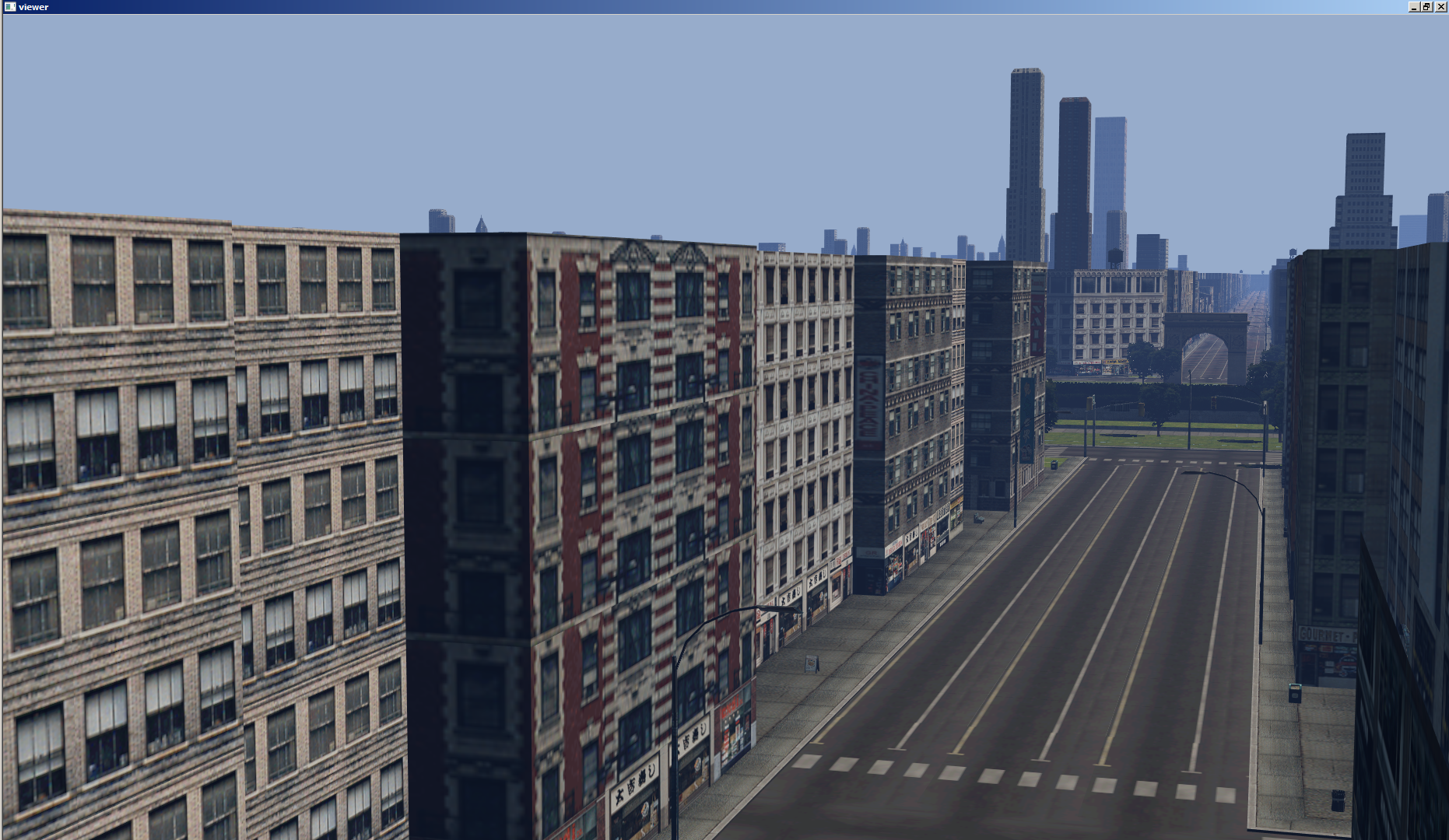 New York besteht aus ungefähr 70.000 Modellreferenzen mit insgesamt etwa 300.000 Dreiecken. Im Augenblick backe ich alle Flächen in eine 40 Megabyte große Vertex-Liste, in der ich außerdem den Texturindex jeder Fläche vermerke. Die 170 Texturen konvertiere ich zu 24-Bit-RGBX (Transparenz habe ich noch nicht im Griff) und stopfe sie in ein 256×256×170 großes Texture Array (ungefähr 30 MiB). Die Stadt wird als einzelner Draw Call gezeichnet; der Texturindex jeder Fläche wandert aus den Vertex-Daten über den Vertex Shader in den Pixel Shader und wird dort im Texture Array nachgeschlagen.