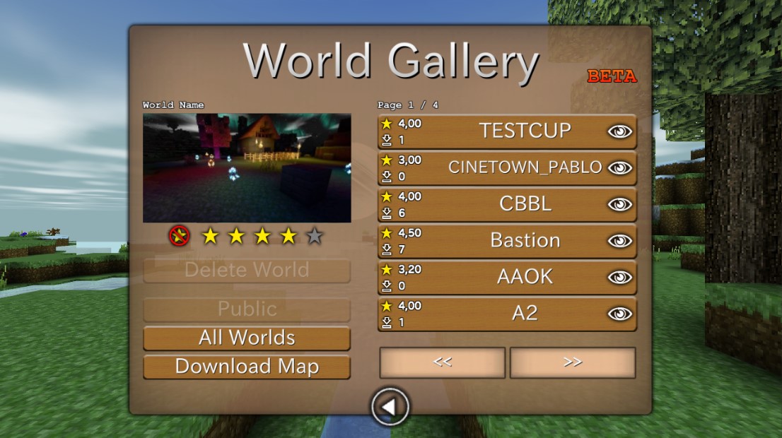 Soweit zum Hintergrund. Im Spiel sieht das Ganze dann so aus: Ich hatte so ein System früher mal auf Windows Phone am Laufen. Dort wurden schon 1000e Welten hochgeladen. Das war für mich dann auch toll, dass ich mir direkt anschauen konnte was die Leute so bauen.