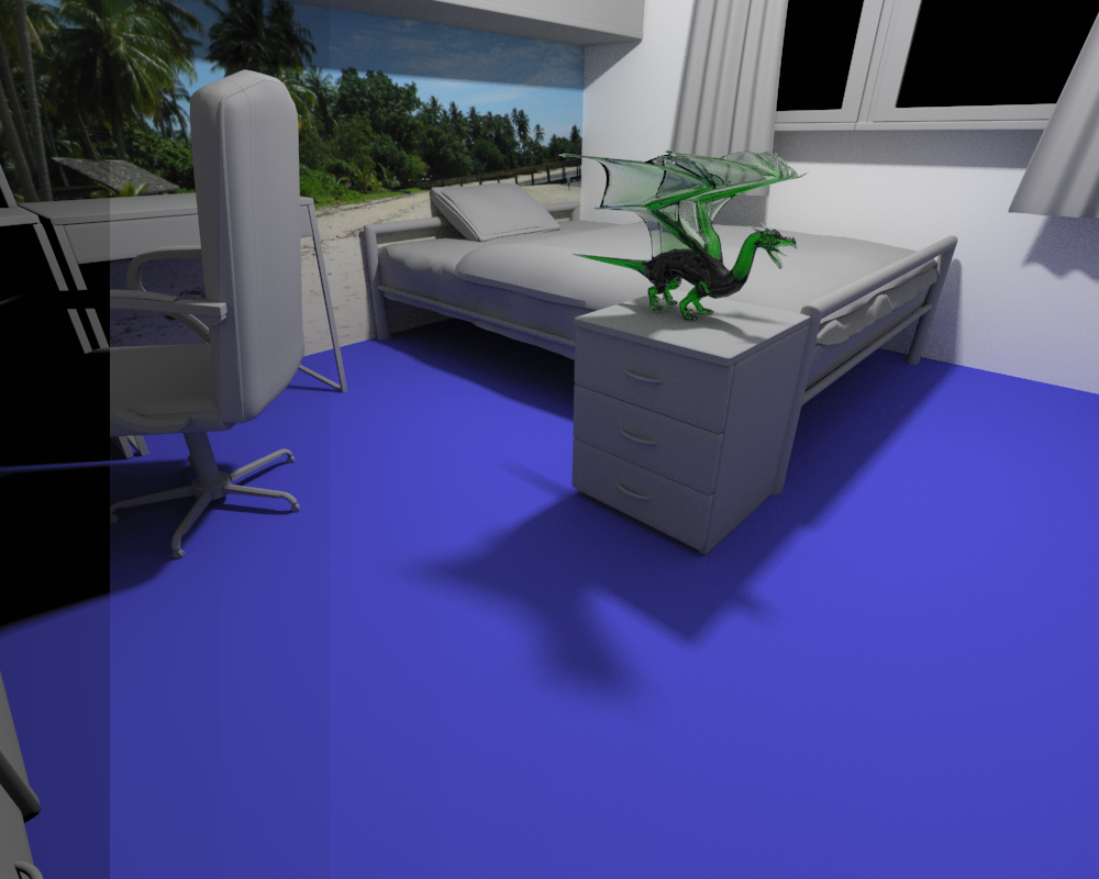 Im Shader wird die Beschleinigungsstruktur traversiert, wobei dann manche Pixel direkt durch sind, andere sehr tief traversieren müssen. Dadurch werden die Threads insgesamt schlecht ausgelastet. Zweiter Punkt ist, dass die Szene und Texturen komplett im Speicher liegen müssen. Was bei der kleinen Szene noch kein Problem ist, aber zum Problem wird es dadurch, dass jeder Pixel ziemlich Random die Beschleunigungsstruktur, die Dreiecksdaten und die Texturen addressiert... das macht jede Form von Caching zunichte. Und ich habe keine Idee bisher, wie ich das verbessern kann, zumal ja nach dem Primärstrahl in jede Richtung gefeuert wird und absichtlich noch random, damit man durch das Rauschen noch eine gewisse Qualitätssteigerung hat, weil leichtes rauschen akzeptiert man eher, als bandings.