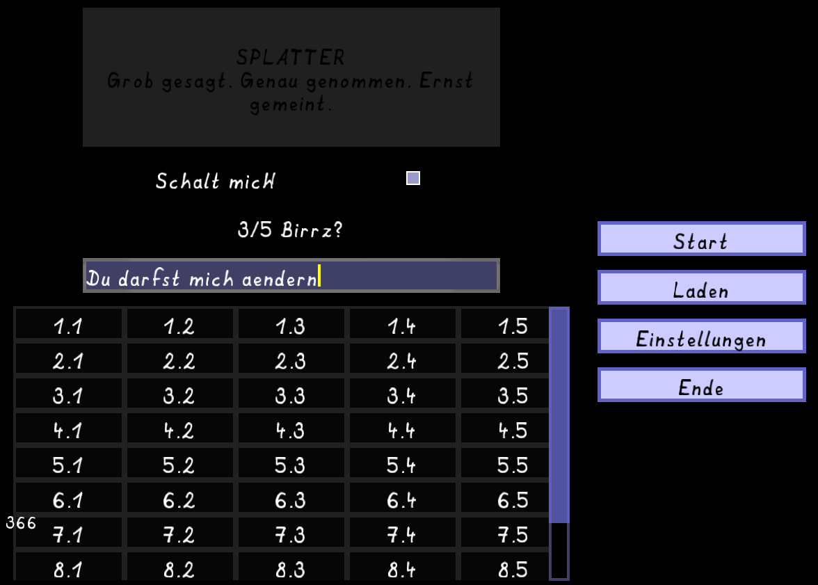 im Zuge des aktuellen "Ich zeig mal, was ich gerade tue"-Trends möchte ich Euch die aktuelle Version von Splatter vorstellen. Das Projekt basiert auf ursprünglich auf unserem Beitrag zur ZFX Action II, ist seitdem aber drastisch umgekrempelt worden. Ich habe mich nun die letzten Wochen viel mit der Architektur dahinter beschäftigt, primär mit der GUI, aber auch mit dem Spiel-Storymodus und der Lokalisierung. Parallel dazu hat Stefan einen Editor geschraubt. Zur Anschauung zwei Bilder: