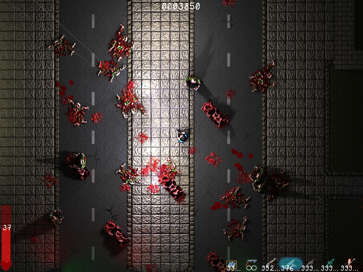 Speziell die letzten Monate hatte ich den Eindruck, dass Zombies gerade wieder ganz heftig Trend sind. Daher ist es jetzt noch um so wichtiger, das Spielelement Licht auszunutzen. Allerdings soll auch nicht jedes Licht so wirken, weil der Spieler sonst die ganze Zeit im Dunkeln spielt. Daher hat nur Licht mit einer fiesen UV-Komponente diese Wirkung, Lichtquellen dieser Art soll man an einem kräftigen Strahlen wie bei Krishtys Sternendemo erkennen. Ich hoffe, das funktioniert dann auch. Beim orginalen Splatter haben die Leute die Lichtfackeln recht bald als praktisch Panik-Lösung benutzt, um sich in dringenden Situationen Luft zu verschaffen. Alle darüberhinaus gehenden Spielmechaniken damit werden wir sehr sorgfältig einführen müssen, vermute ich.