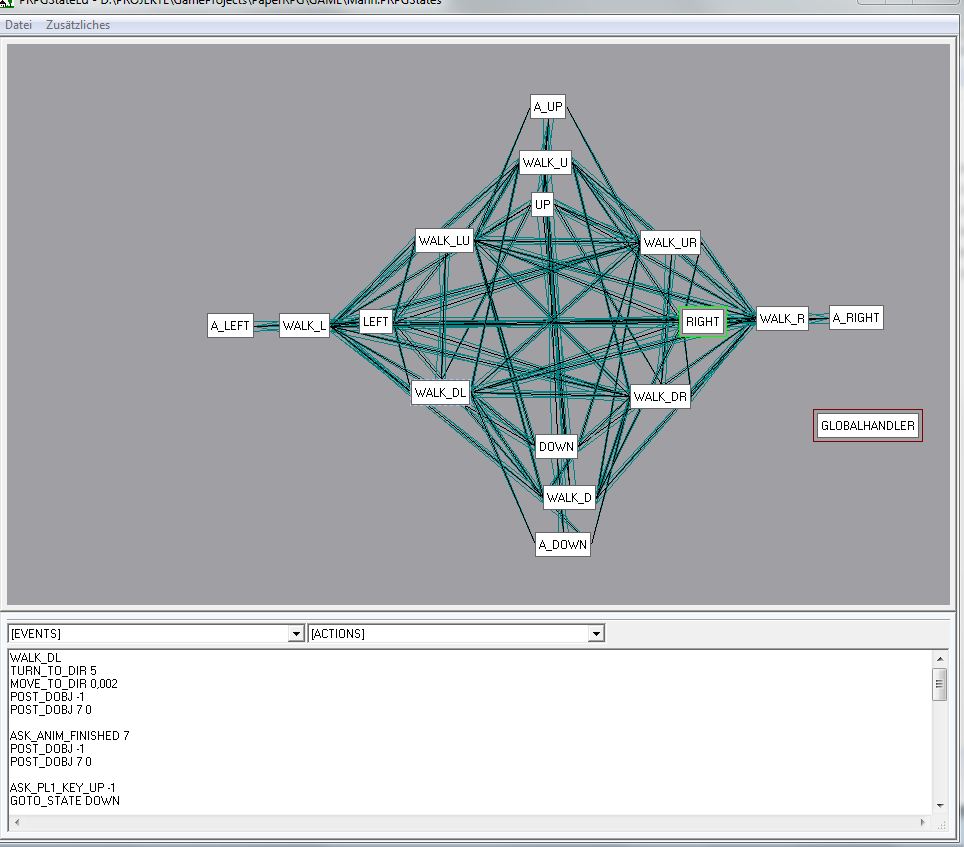 Ansich ist das ja alles leicht zu programmieren, ich weiß nur noch nicht so ganz, wie genau ich es am schönsten machen soll. Es hört sich ja vielleicht ein wenig nach Statemachine an, man kann rumlaufen, angreifen, tot rumliegen und so weiter. Allerdings möchte man ja auch im Laufen angreifen können, aber eben nicht, während man gerade durch einige Treffen nach hinten taumelt. Es gibt also irgendwie eine Reihe an Zuständen beziehungsweise Aktionen, die man gleichzeitig oder eben nur exklusiv ausführen kann. Das ganze soll halt möglichst flexibel gestaltet sein, einmal wegen der übersicht und zum anderen, weil man bei einem so komplexen System ja bestimmt prima komsiche Bugs einbauen kann, bei denen dann plötzlich Dinge passieren, die eigentlich nicht möglich sein sollten.