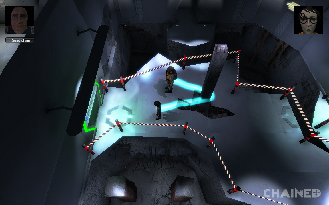 Chained ist ein Action-Adventure in dem zwei durch eine Energiekette verbundene Insassen aus einem Sci-Fi Arbeitslager ausbrechen müssen. Durch das Verwenden der Kette als einzige Waffe und die Kombination ihrer unterschiedlichen Fähigkeiten müssen sich diese durch Scharen von Kampfrobotern kämpfen und knifflige Rätsel lösen, um den Weg zur Außenwelt zu finden.