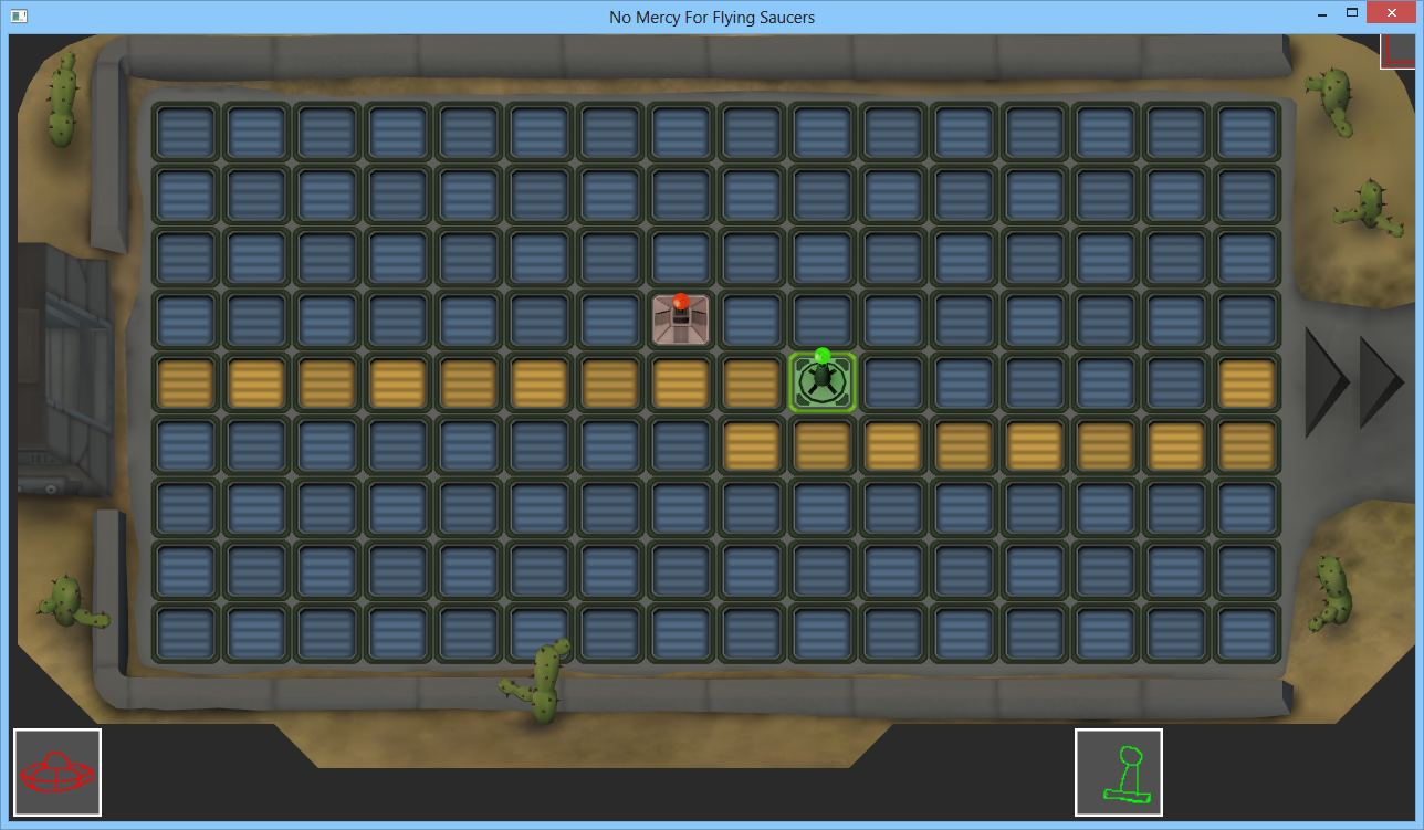Wie bei TowerDefense gewohnt kommen von links die Gegner (in dem Fall Ufos) und wollen durch das Feld durch, hin zum rechten Rand. Es wird Unterschieden zwischen einer Bau-Phase und einer Wave-Phase(Gegnerwelle), in der nicht gebaut werden kann. Die Steuerung wird komplett via Maus/Touch stattfinden. Ich teste es immer wieder auf meinem x86 Tablett. Drei Turm-Typen sind in Planung: Angriff, Gift und Gefrier. Außerdem kann jeder Turmtyp zweimal aufgelevelt werden. Von den Ufos gibt es drei Typen, welche sich in Geschwindigkeit und Schadensaufnahme unterscheiden. Zerstören eines UFOs gibt Credits, welche wiederum mit der aktuellen Anzahl an verbleibenden Leben verrechnet und dem Score gutgeschrieben werden.