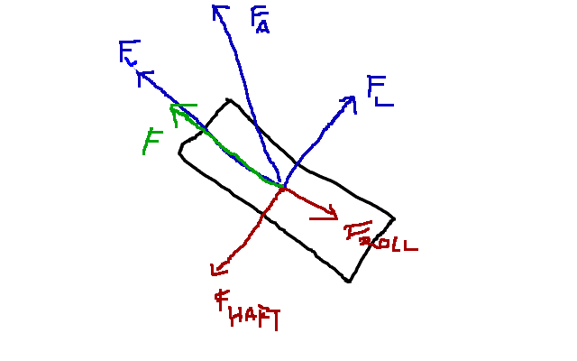 F_A ist die Antriebskraft und kann in die Komponenten F_V (Rollrichtung) und F_L (Seitwärts) zerlegt werden. F_L wirkt im nicht rutschenden Fall die Haftreibung entgegen. F_V wirkt eine Rollreibung entgegen. Daraus ergibt sich F als resultierende Kraft.