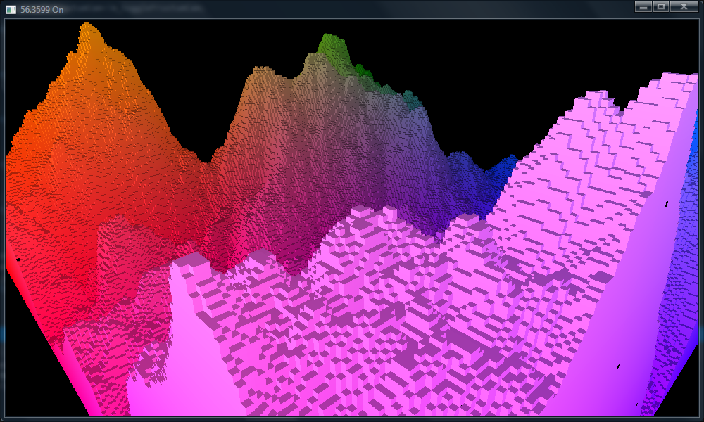 ich hatte am Wochenende Lust etwas mit Voxeln zu spielen. Das ganze Testprogramm war ziemlich schnell zusammengebaut. Die Welt wird aus einer Heightmap erstellt (256x256). Ich verwende eine Chunkgröße von 32x32x32 Blocks. Für jeden Block wird die Farbe, Position sowie 1 Byte mit aktiv/inaktiv, sowie jeder aktiven Seite des darzustellenden Würfels gespeichert. Die Aktiven Würfel werden im Indexbuffer gespeichert. Texturen habe ich erstmal außen vorgelassen.