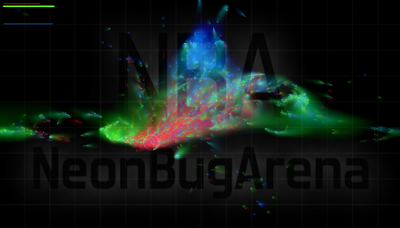 Gameplay-Shot. Man tritt in deutlicher Unterzahl gegen einen oder mehrere andere Schwärme an (hier Rot=Spieler gegen Grün und Blau) und muss versuchen, irgendwie durch Ausweichen, Rückzug und Sturm trotzdem zu gewinnen. Die Balken oben zeigen den Schwarm mit den aktuell meisten Membern an, sowie die anderen Parteien im Verhältnis. Als Steuerung kann man Ziele per Klick setzen, um einen Teil des eigenen Schwarms an eine bestimmte Stelle zu dirigieren.
