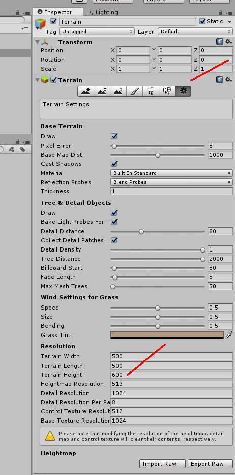 Zu der Größe: Dein Terrain hat zum einen eine Größe in Quadraten (Länge, Breite) und in Ingame-Einheiten (Länge, Breite). Das erste gibt die Auflösung deines Terrains an, das zweite die tatsächliche Größe.
