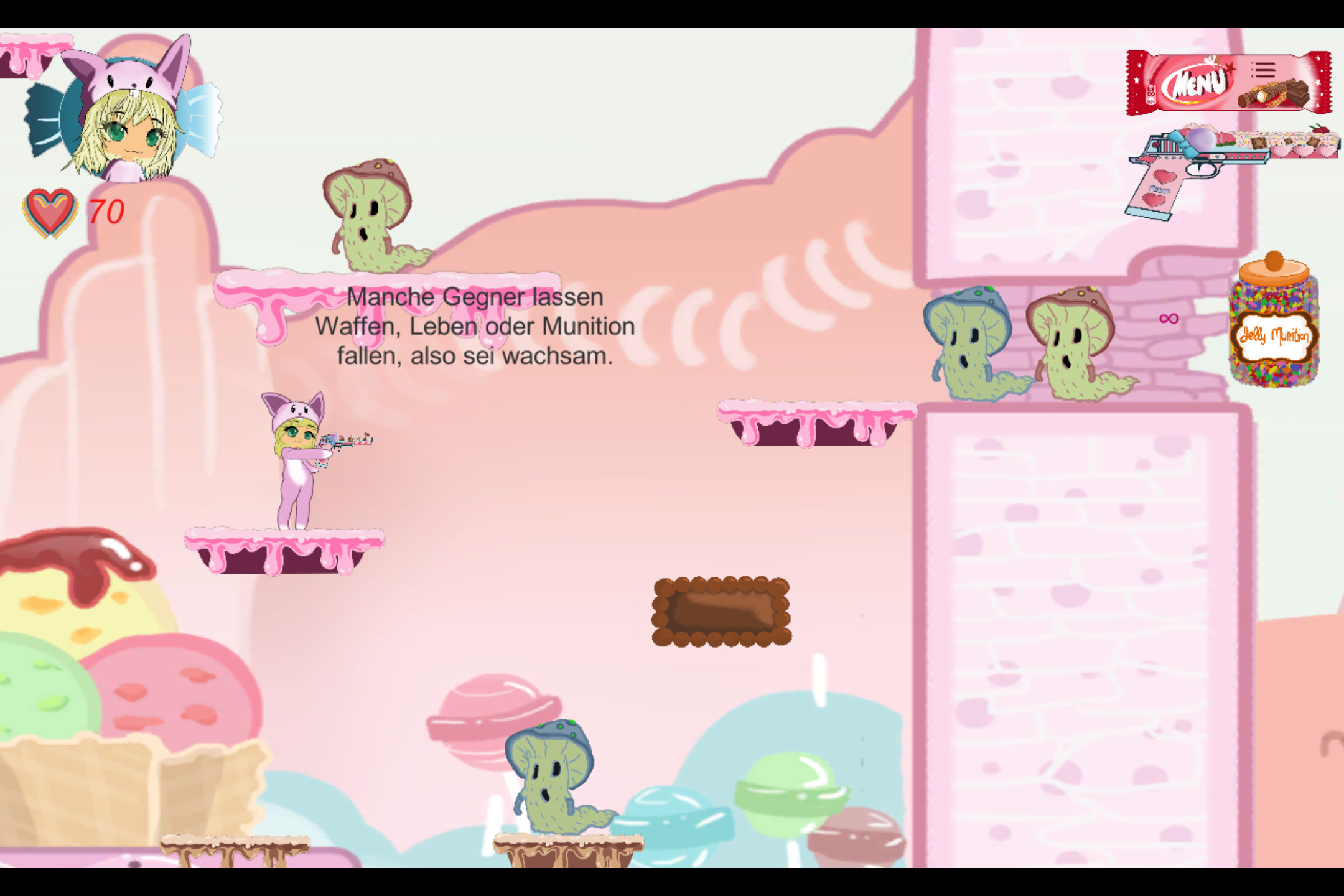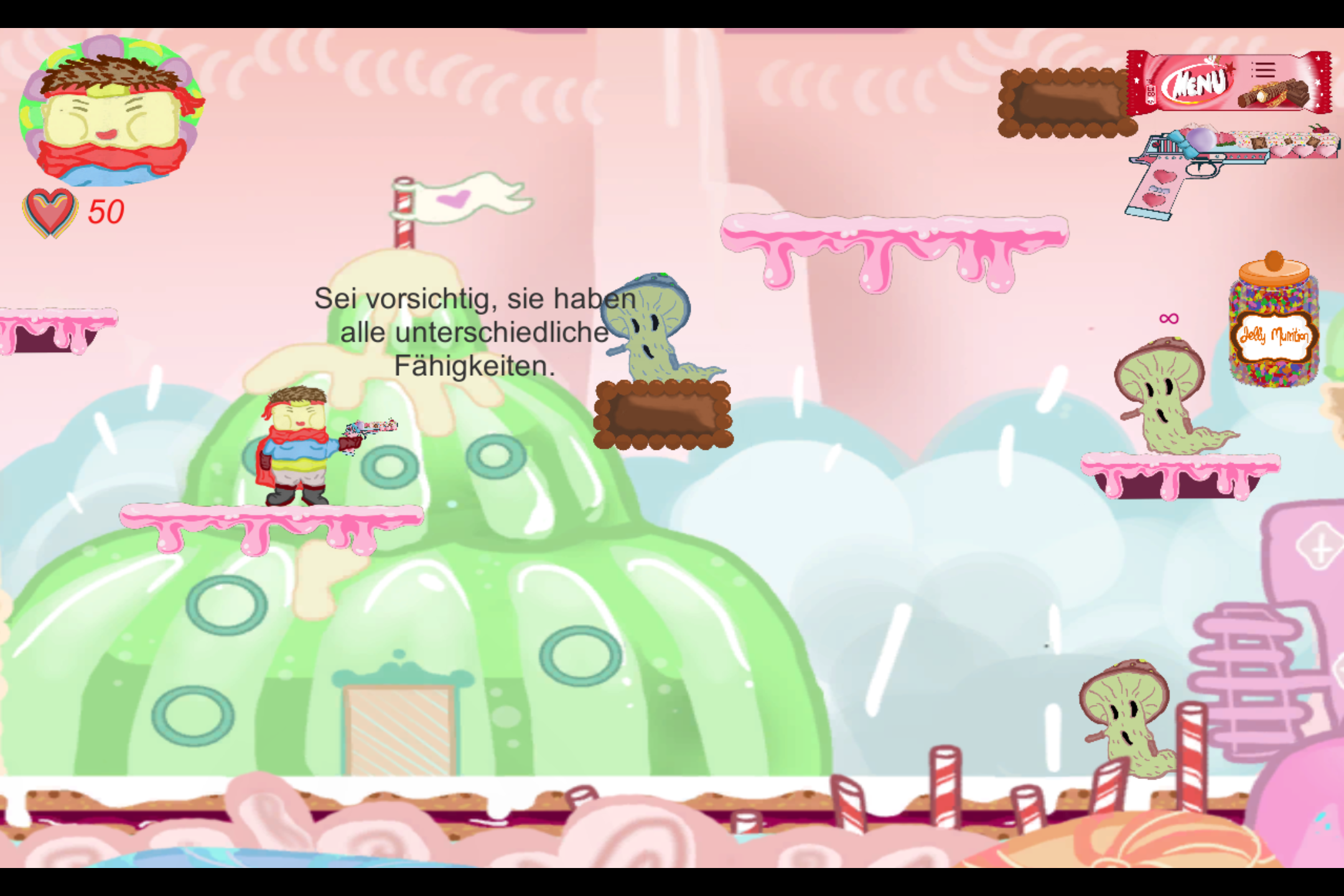 Unser Team entwickelte ein Demolevel zum selbst erdachten Spiel Yggi Candy, ein Actionplattformer, in dem der Spieler einen von zwei wählbaren Charactern durch das Land der Süße Goldohun bis hin zum Bösewicht im Nachbarland des Gemüses Teeb führt. Im Demolevel erwartet den Spieler eine Invasion von bösartigen Gemüse- und Pilzmonstern, die aus dem Nachbarland in das Land der Süße gestürmt kommen, um dieses zu vernichten. Die beiden Character gehören dem Hüterorden des Landes Goldohun an. Mit ihrem Mut und ihrer Tapferkeit kämpft ihr euch durch die Horden der Gemüsesoldaten und verteidigt erfolgreich euer Land, aber werdet ihr es auch schaffen, den Frieden auf Dauer zu waren?