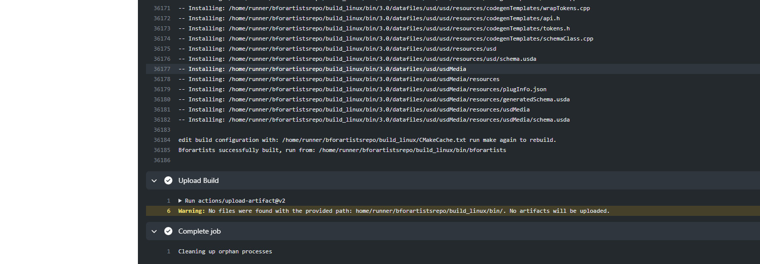 So siehts jetzt grade aus. Im Moment rennt es mit dem absoluten Pfad um zu testen ob er beim upload-artifacts die bin Directory dann findet. Und dann muss ich noch schauen wo der Upload dann zu finden ist. Vielleicht gibts ja auch eine Möglichkeit da ein Archiv zu erstellen. Aber das ist nicht mehr wirklich wichtig. Wichtig war ein grünes Pass zustande zu bekommen damit man sehen kann dass das Build fehlerfrei kompiliert.