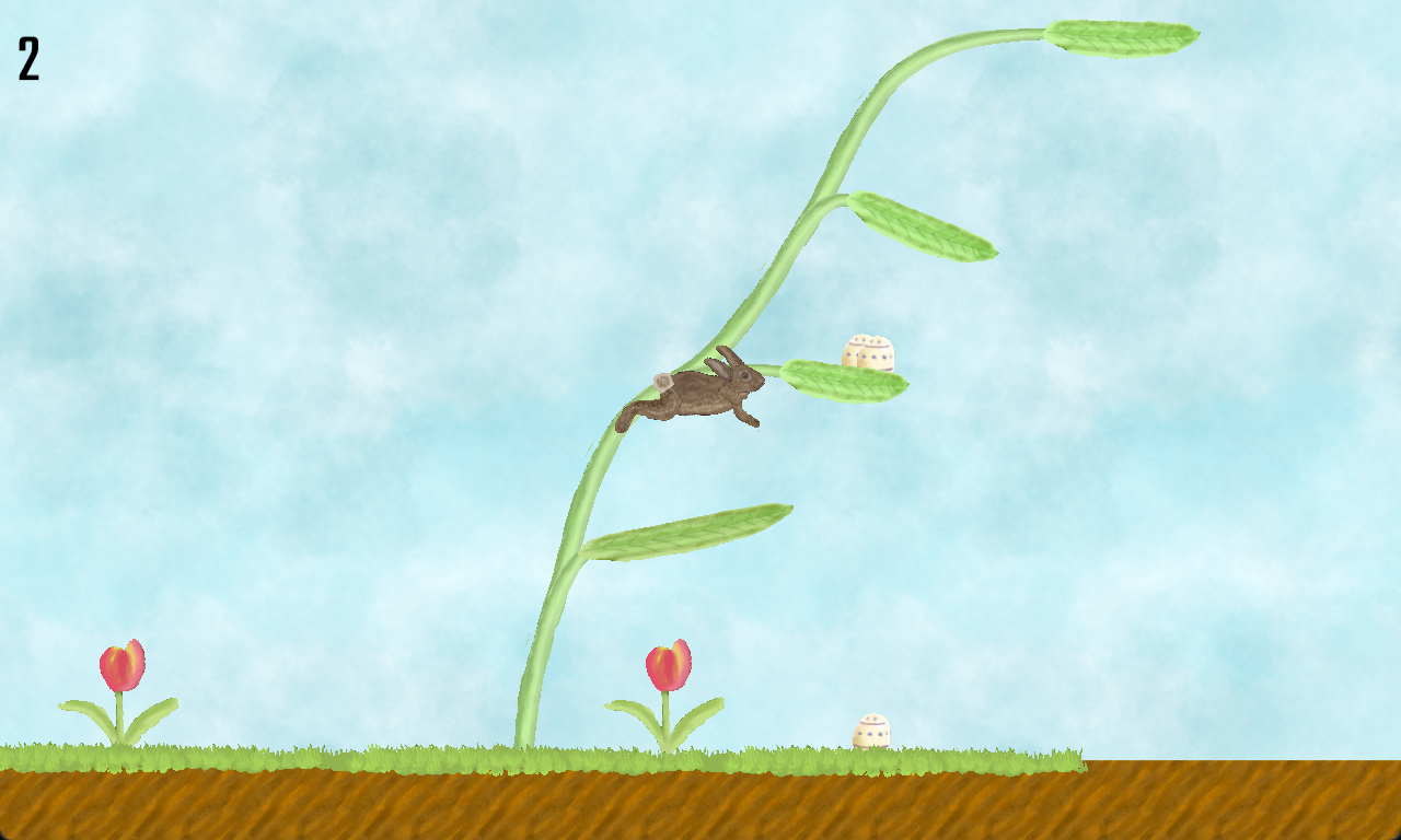 Die Woche war schon über die Hälfte rum und es gab noch kein Spiel, nur ein paar Elemente und einen animierten Hasen. Ich wollte eigentlich kleinere, etwa Bildschirmgroße Level bauen in denen man den Ausgang finden muss, nachdem man Eier eingesammelt, Schalter umgelegt, Gegner besiegt und, ach, das wird doch eh nix. Als ich darüber nachdachte, auch Levelelemente hübsch zu animieren dachte ich über den Wachstum von Pflanzen nach, und da kam mir die Idee: In der Mitte des Levels ist eine riesige Pflanze die unendlich hoch nach oben wächst und man muss sie emporklettern in dem man von Blatt zu Blatt spring und nebenbei Eier einsammeln. Kein Leveleditor, relativ wenig Spielelemente, keine Gegner, Highscorejagt, oder anders gesagt, das perfekte Spielprinzip für so ein Minigame. Nun gut. Hier mal ein Video vom aktuellen Stand: