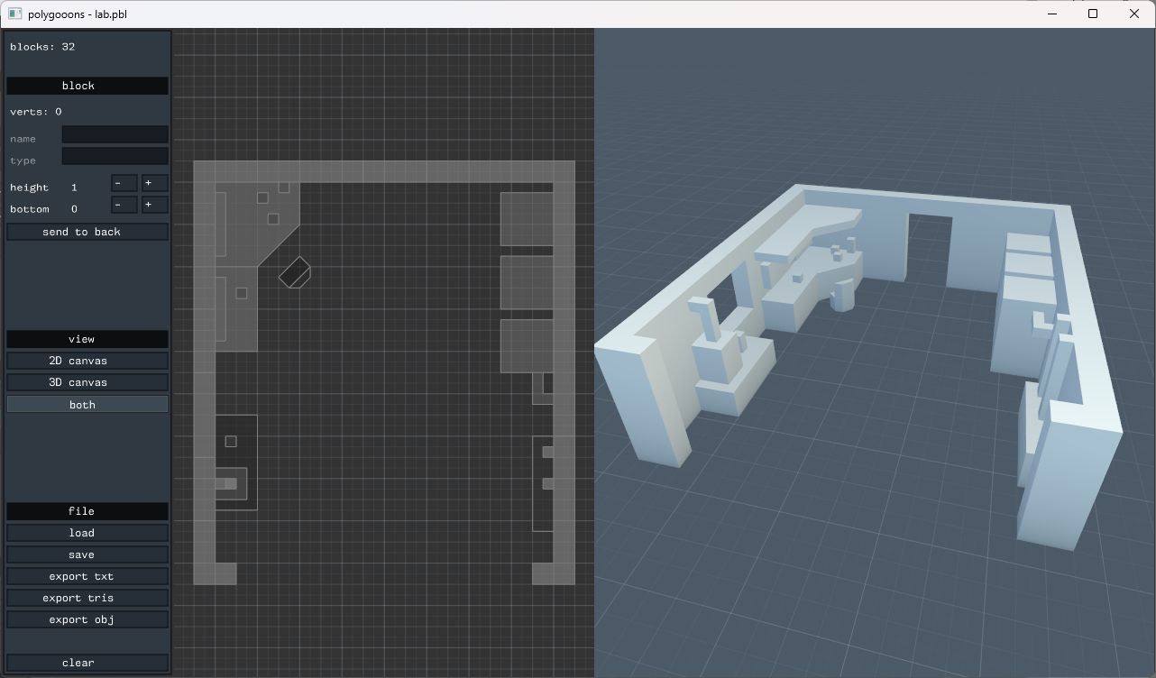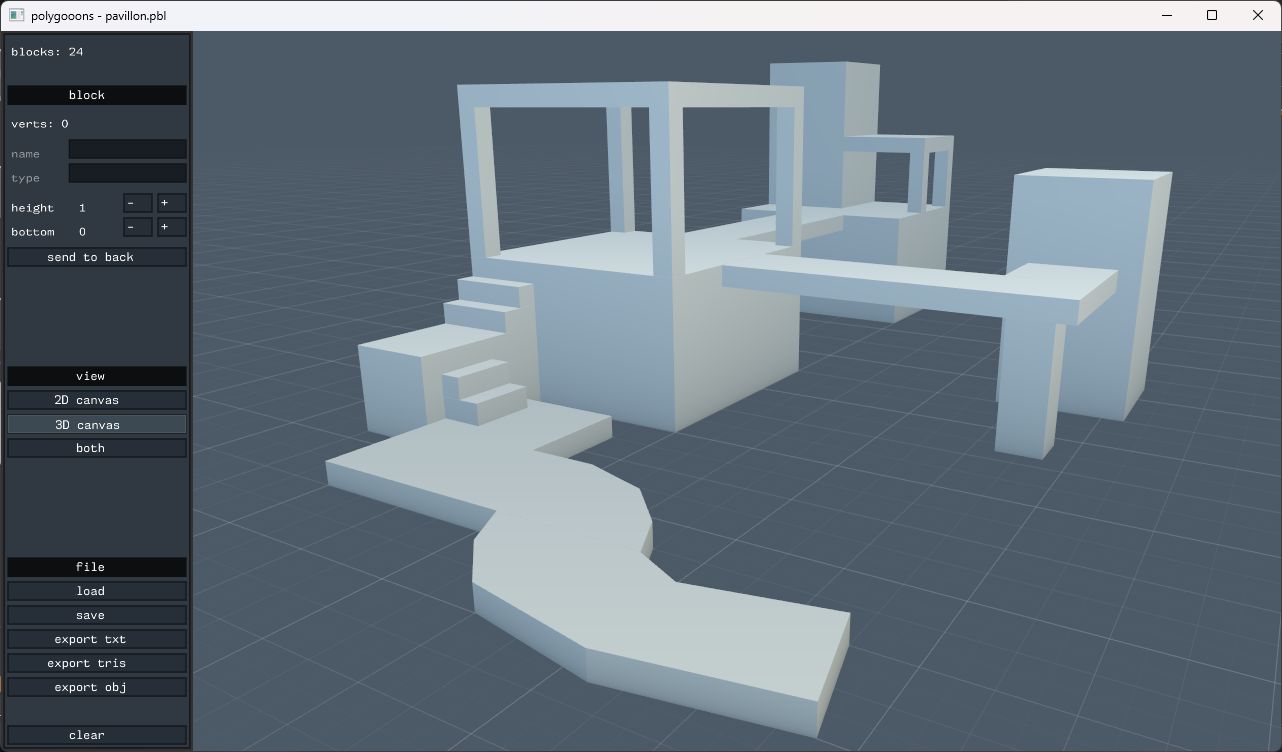 Ursprungsgedanke war, Polygone per Maus in 2D bearbeiten zu können. Dann irgendwie tesselieren, und einfache World-Y-Extrusion per Parameter dazu (Bodenhöhe, Blockhöhe), und schon kann man einfache 3D-Umgebungen für Prototyping basteln. Ein bischen wie Doom1-Levelgeometrie, mehr oder weniger.
