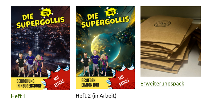 Die Supergollis, das sind meine 3 Kinder Luke, Manu und Pia. Sie erleben zusammen Abenteuer und sind ziemlich kreativ. Deshalb haben sie auch eine Comic-Heft-Serie, sowie Sammelkarten/Spielkarten von sich herausgebracht.